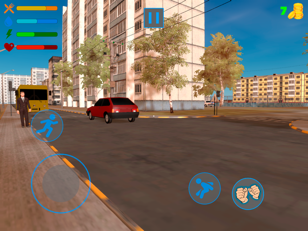 Welcome to the game that will immerse you in the atmosphere of the USSR, where you are an ordinary guy who lives, goes to school and tries to earn a living. But not everything is so simple, in the game you will find various obstacles, the atmosphere of the streets, fights, showdowns and chases with the police, you can both have fun in the game, completing various tasks, and rob people, you can also increase your authority by showing who is the stronger of you, do not forget to monitor the food indicators, water, health. Train your endurance by running outside the city, or practice on the horizontal bars. In the game you do not lose, if you run out of health, or the police catch you, or you get beaten, you will find yourself at home in the morning, there is also a lot of entertainment, you can go to school, you can kick a ball in the yard, or leave the ring, jump on a trampoline, just fight and much more. Play with pleasure!