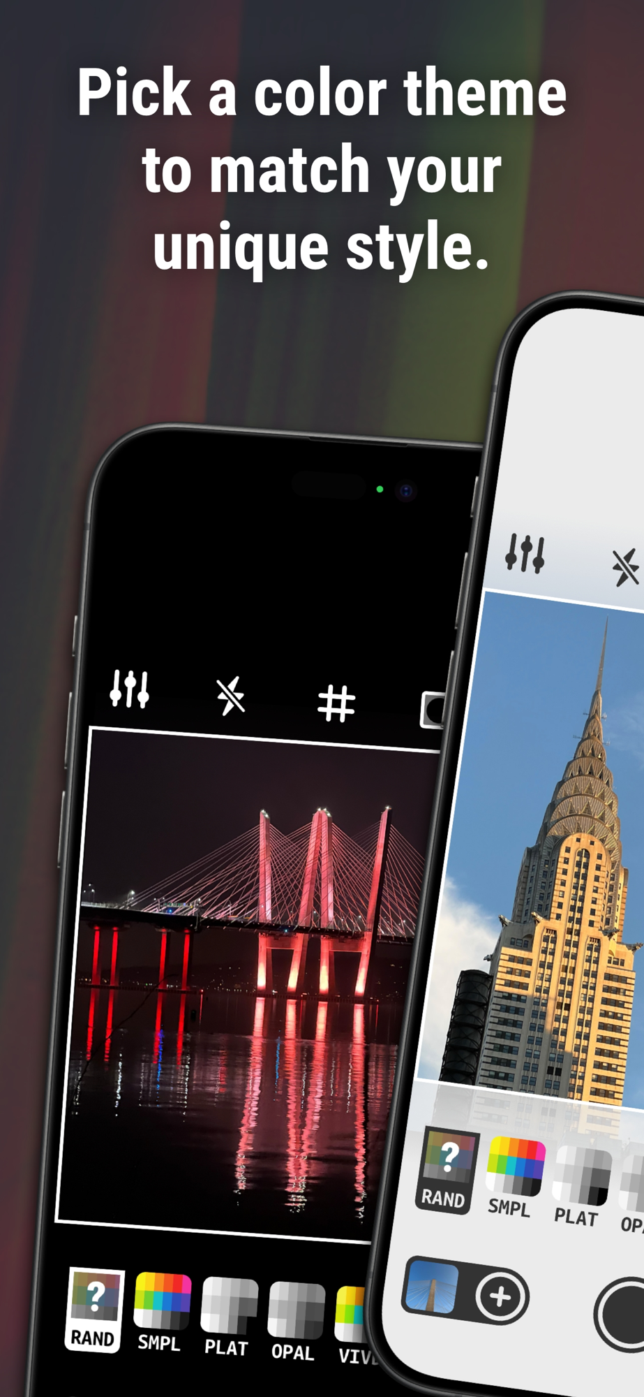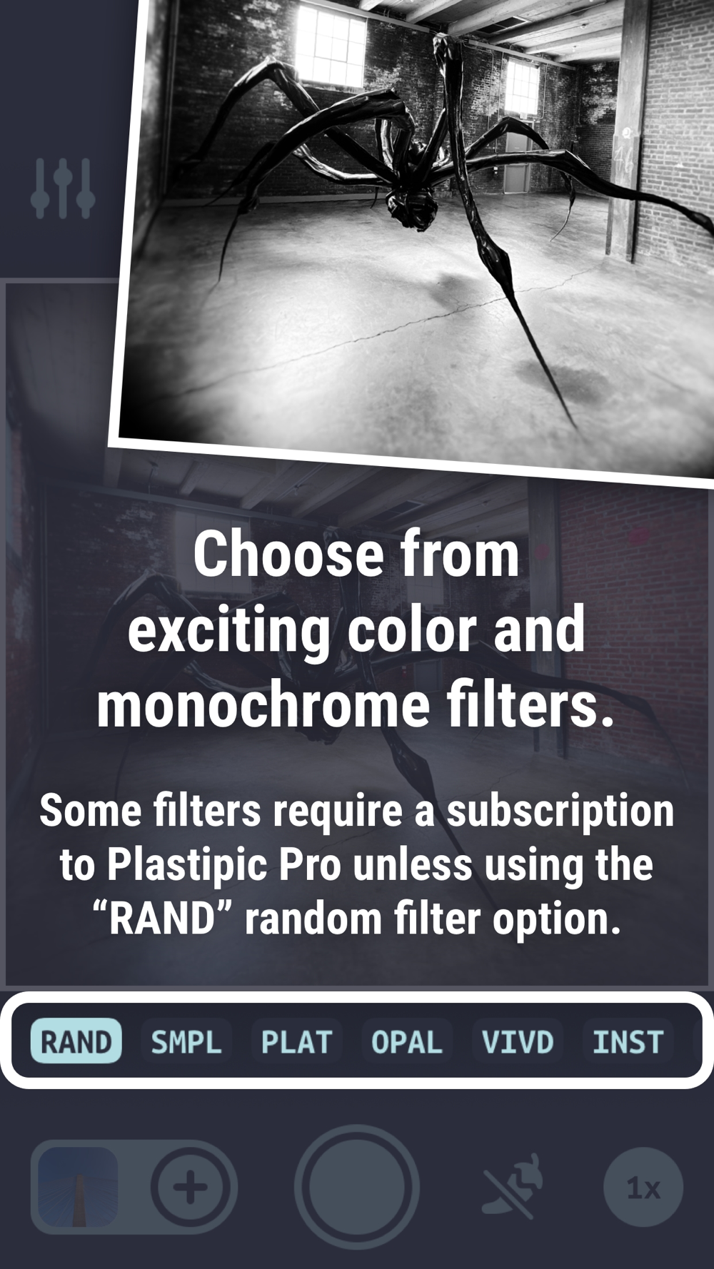 Take photos using a variety of beautiful color and monochrome filters. Some filters require a subscription to Plastipic Pro unless using the "RAND" random filter option.