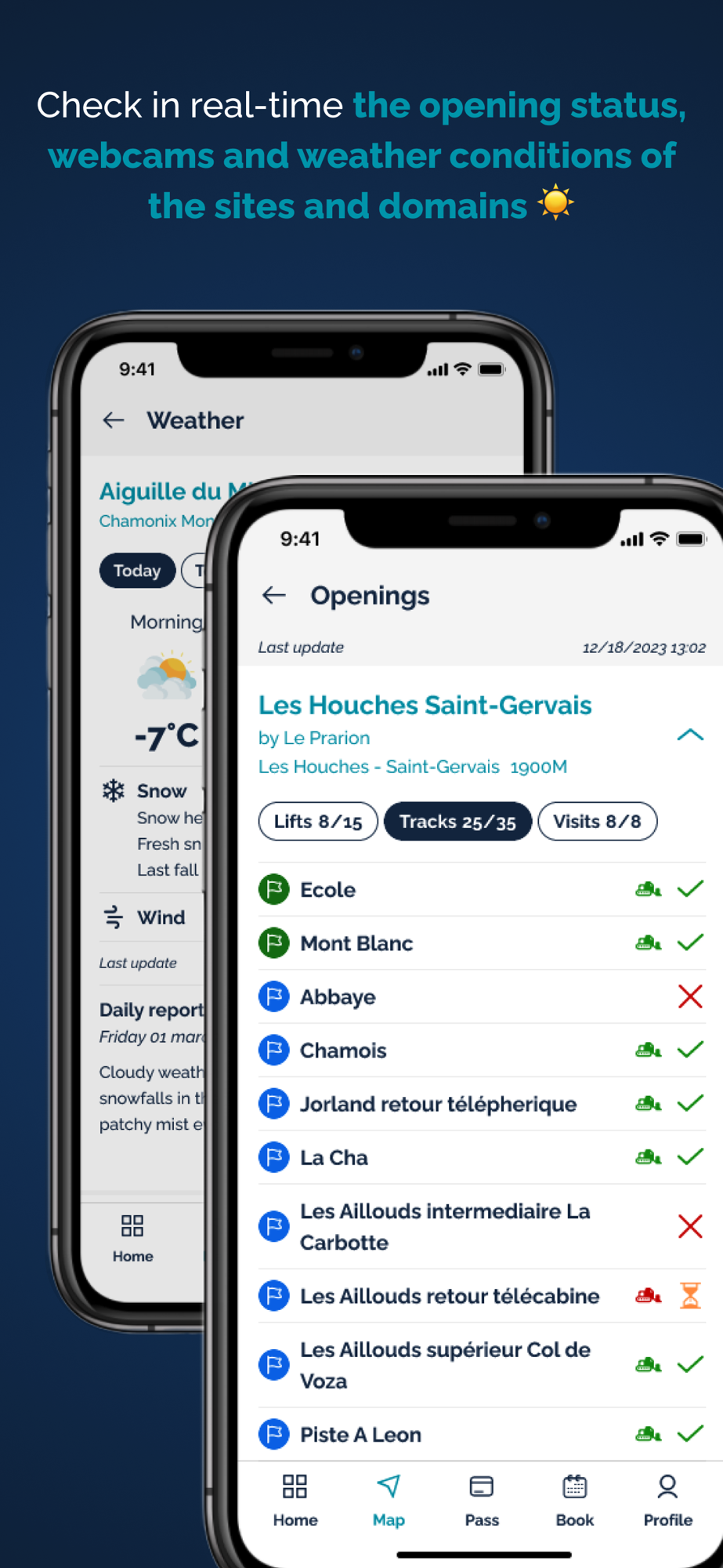 - A map to easily locate yourself while discovering all points of interest (ski areas, excursion sites, beginner domains, restaurants, etc.)