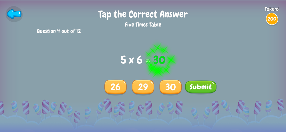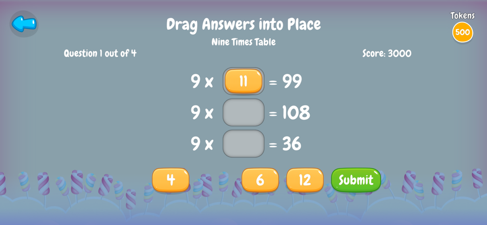 Learn then Play Times Tables offers 147 Times Tables levels, and completing each educational level earns up to 100 Play tokens for the included match 3+ game which has 100 playable levels. Each Table is presented in a host of ways, with True or False, tap the answer, drag to complete, drag 3 from 4 and of course learn and review the Table itself. Without doubt anyone completing this App should have an excellent Times Tables knowledge. What is more they will have had fun through learning. Each practice lesson is awarded 1 to 3 stars with 3 stars gaining the greatest reward. The App tracks past progress so the child can return to achieve 3 stars on any level at any time. If they get the answer wrong the App will show the correct answer immediately. The App is progressive with the easier tables first and it completes with 2 super tests that cover everything learnt. Question sets are generated randomly, so if the child revisits an exercise the questions will be in a different order and if the subject information set is large enough (i.e. larger number set) most questions will be different altogether.
