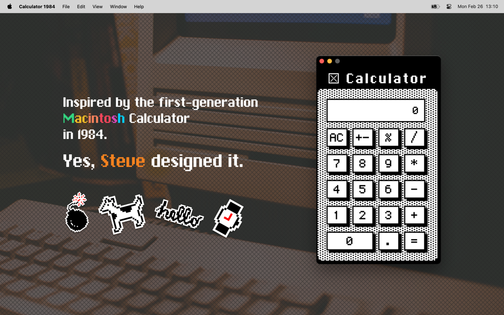 While honoring the classic, we also strive to provide users with the opportunity to express themselves and showcase their uniqueness. Therefore, "Calculator 1984" introduces the Sticker feature, offering a series of carefully designed pixel-style stickers—from the iconic Macintosh Dogcow and Bomb to a portrait of a young Steve Jobs. Each sticker is a tribute to the Macintosh culture, making each user's "Calculator 1984" truly one-of-a-kind. We encourage users to decorate their calculators with these artistically inspired stickers, turning it into a personal object that showcases their identity.