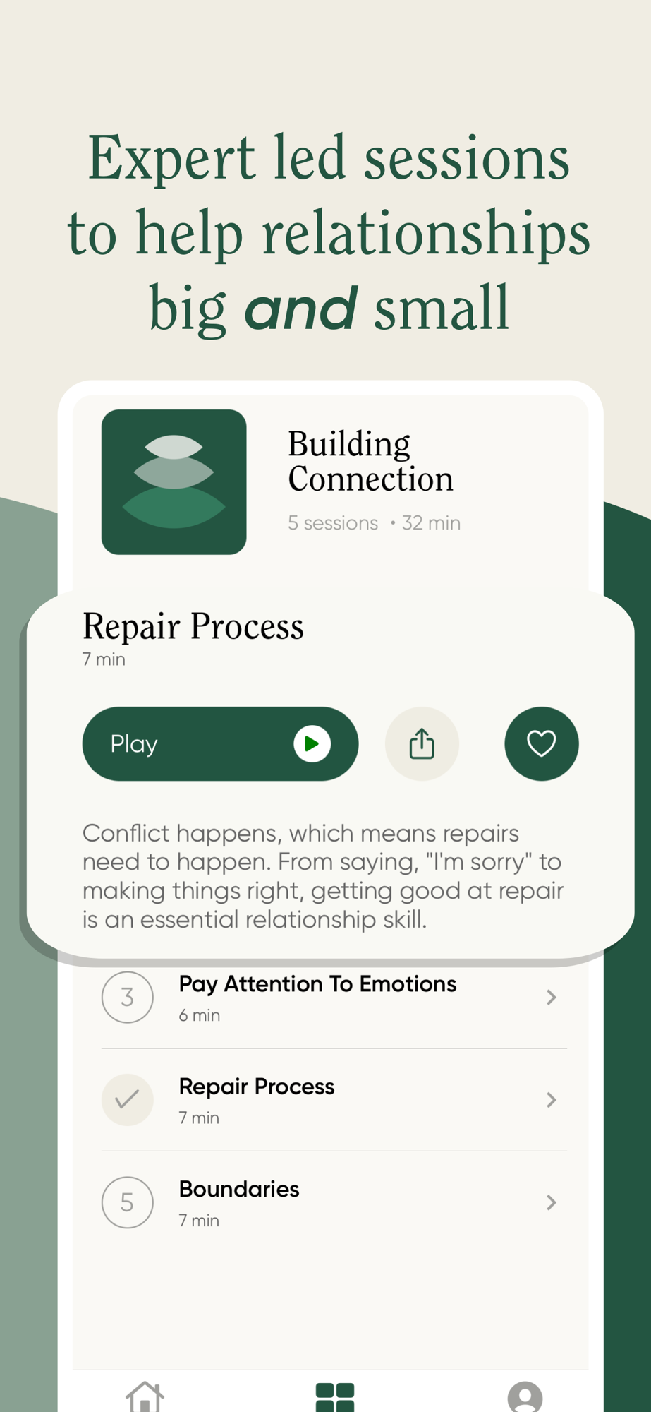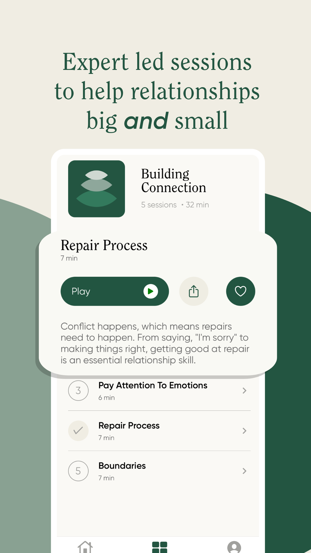Personalization: Relatable caters to all types of relationships. During onboarding, you’ll select the areas you want to focus on, and we’ll create a customized queue of sessions to get you started.