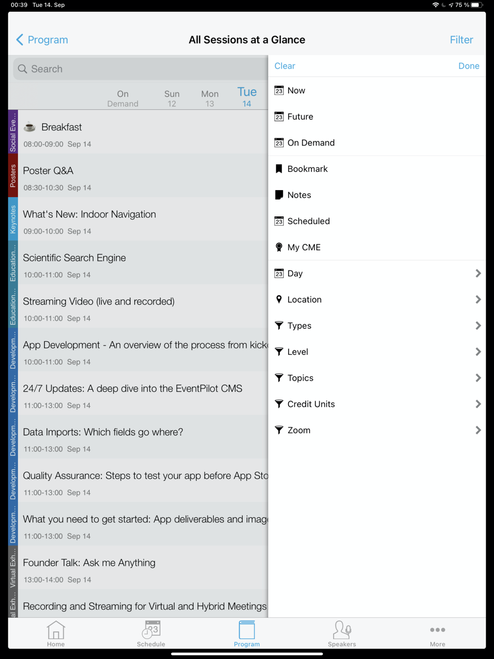 • Program: Browse the entire event program to build your personal schedule, bookmark sessions or speakers, or access session handouts as available.
