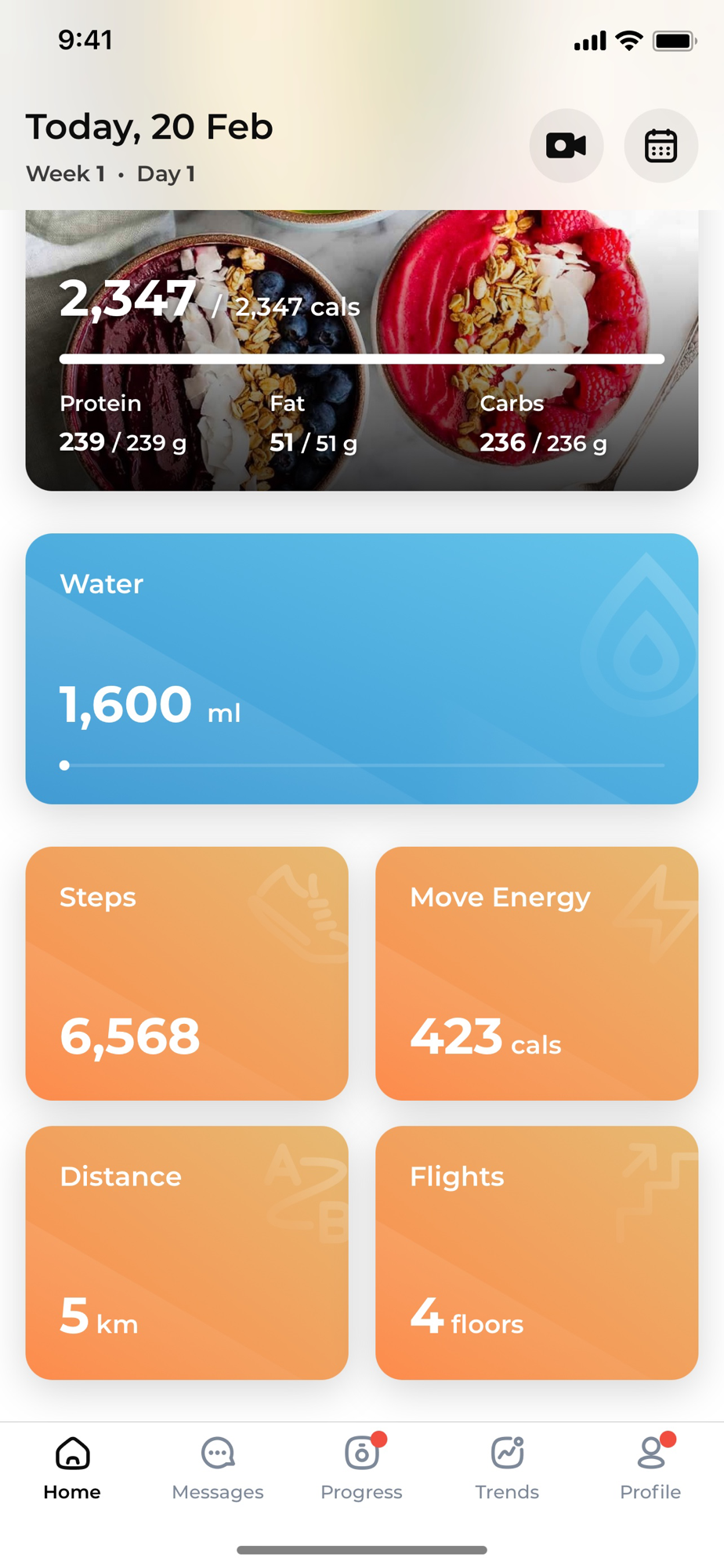 The app integrates with Apple Health to show your daily activity - distance, steps, active energy, and flights to help you better achieve your goals.