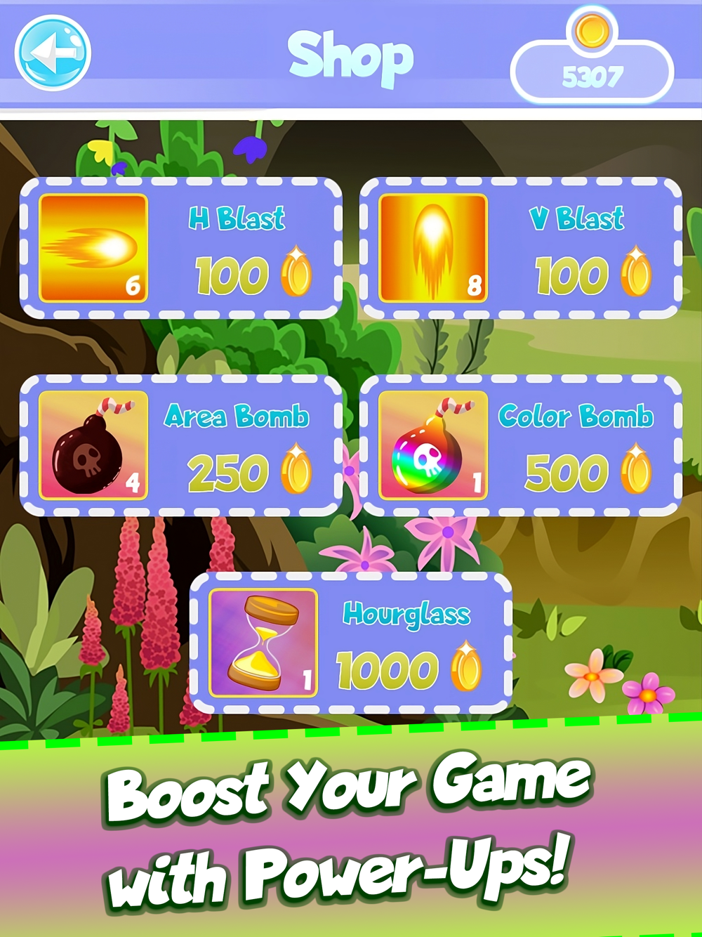 - Shop & Power-ups: Use coins to buy power-ups or earn them through gameplay. From horizontal blasts to the exclusive hourglass, tailor your strategy to overcome challenging grids.