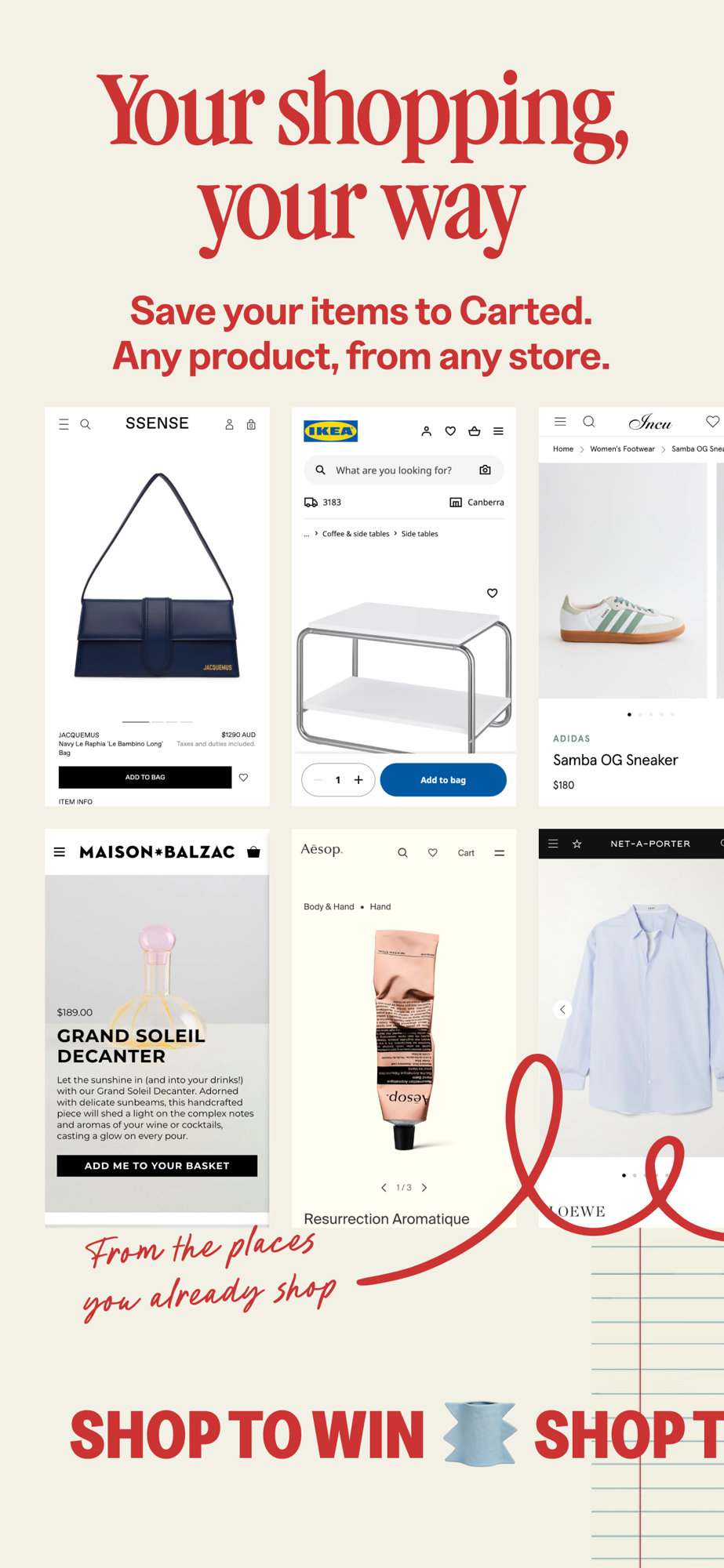 Don’t change where you shop. Save your items to Carted as you browse. Save any product, from any store.