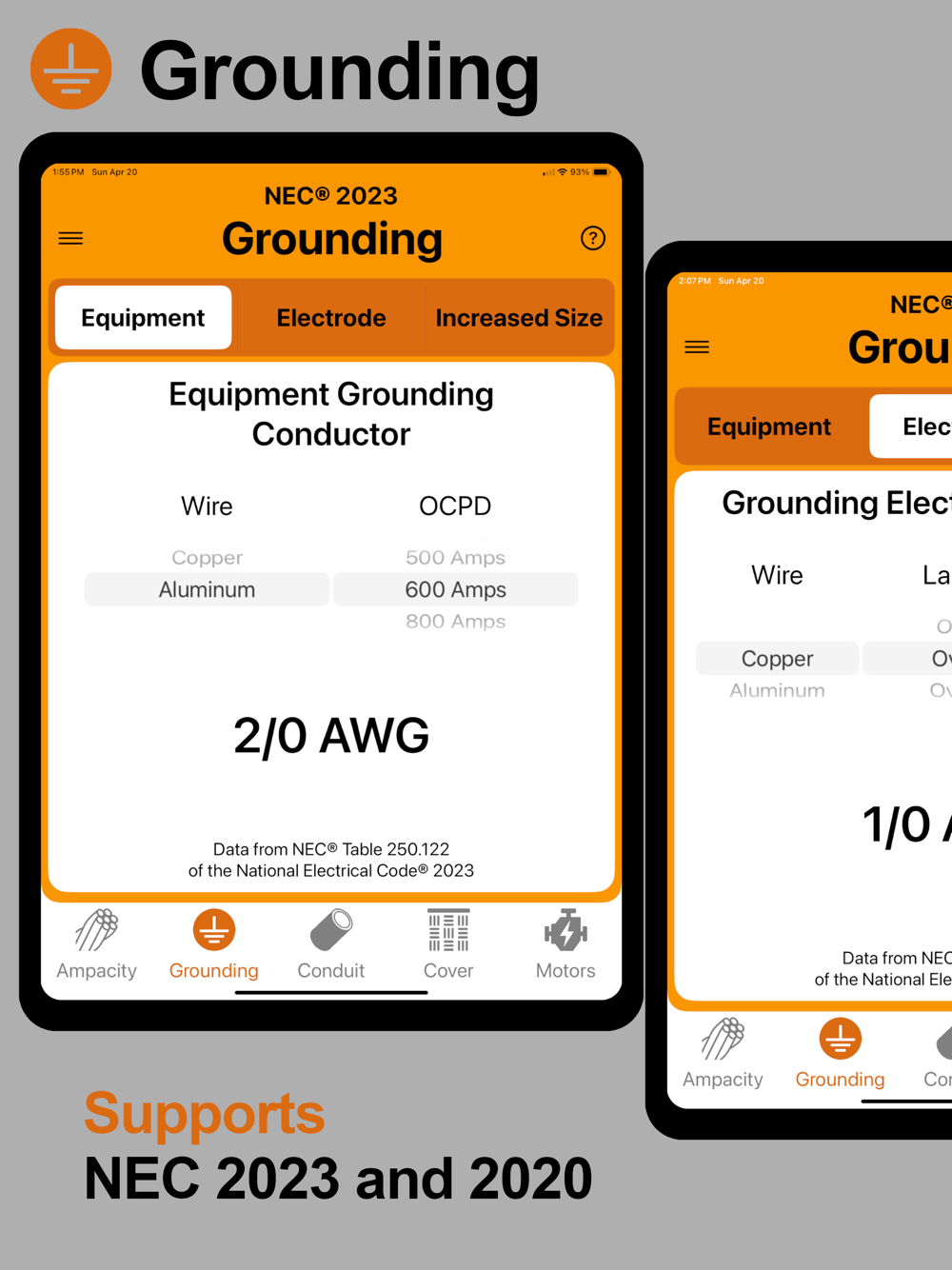 The NG Wire™ app comes with table data and calculations from both the 2023 and 2020 NEC®. Your subscription gives you access to future versions that will include NEC® updates. New data years will be added when released by the NEC® which typically happens every 3 years. Prior years data will remain in the app until there are no states in the USA that are using the data. Notice will be given prior to removing this data.