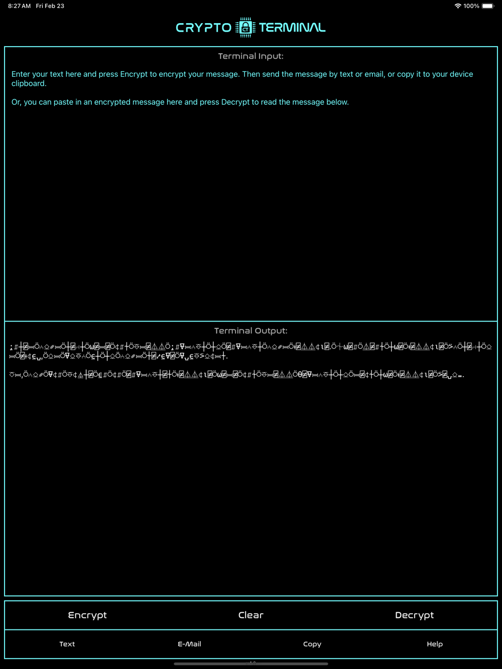 Crypto-Terminal is a fun and exciting application for those that are fans of cryptology! This app provides the capability to type or paste in text to encrypt or decrypt. Users have the option of texting or emailing encrypted/encrypted messages, or copying the encrypted/decrypted messages to their clipboard for use in other applications. Built in help feature provides instructions for use of the app.