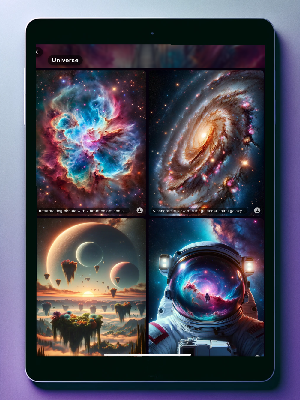 Descarga y Comparte Fácilmente: ¿Encontraste un fondo que refleja tu estilo? Descárgalo en alta resolución con un simple toque. Comparte tus fondos favoritos generados por AI con amigos y familiares o en redes sociales, mostrando tu gusto único.