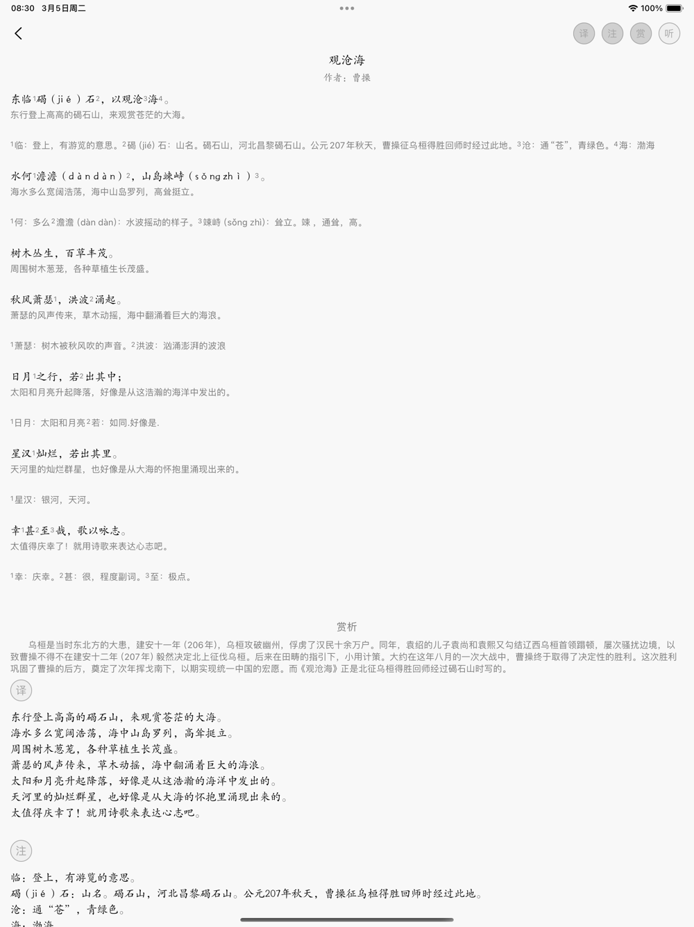 提供七年级、八年级、九年级所有必背的古诗文、文言文,同步提供每篇文章的翻译、注释、赏析、朗读四大功能。在学习语文的同时,还可以同步收听优美的朗读音频。其中,包含的古诗文如下:
