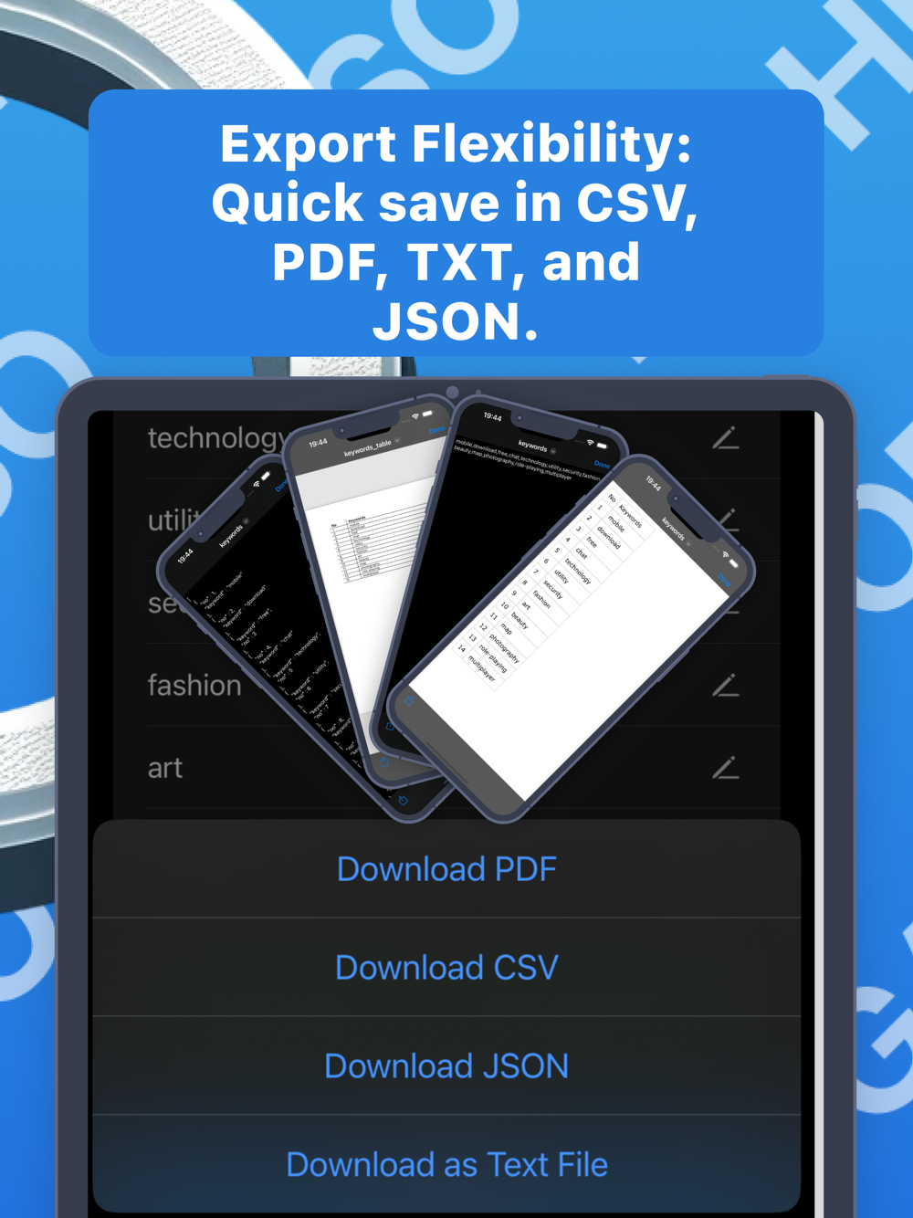 Unlock the full potential of PutKey with our Pro version. Pro users have exclusive access to download their data in various formats including CSV, PDF, TXT, and JSON, enabling a more flexible and comprehensive analysis. Without upgrading to Pro, users can continue to enjoy the basic feature of copying text directly within the app. Upgrade to Pro today and maximize your app's visibility and performance on the App Store.