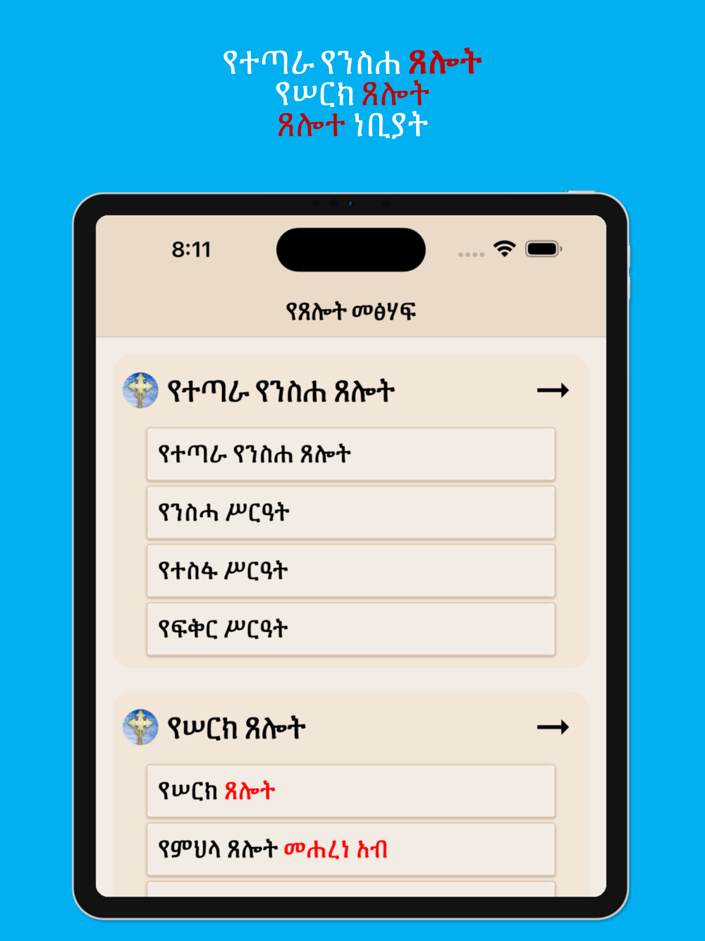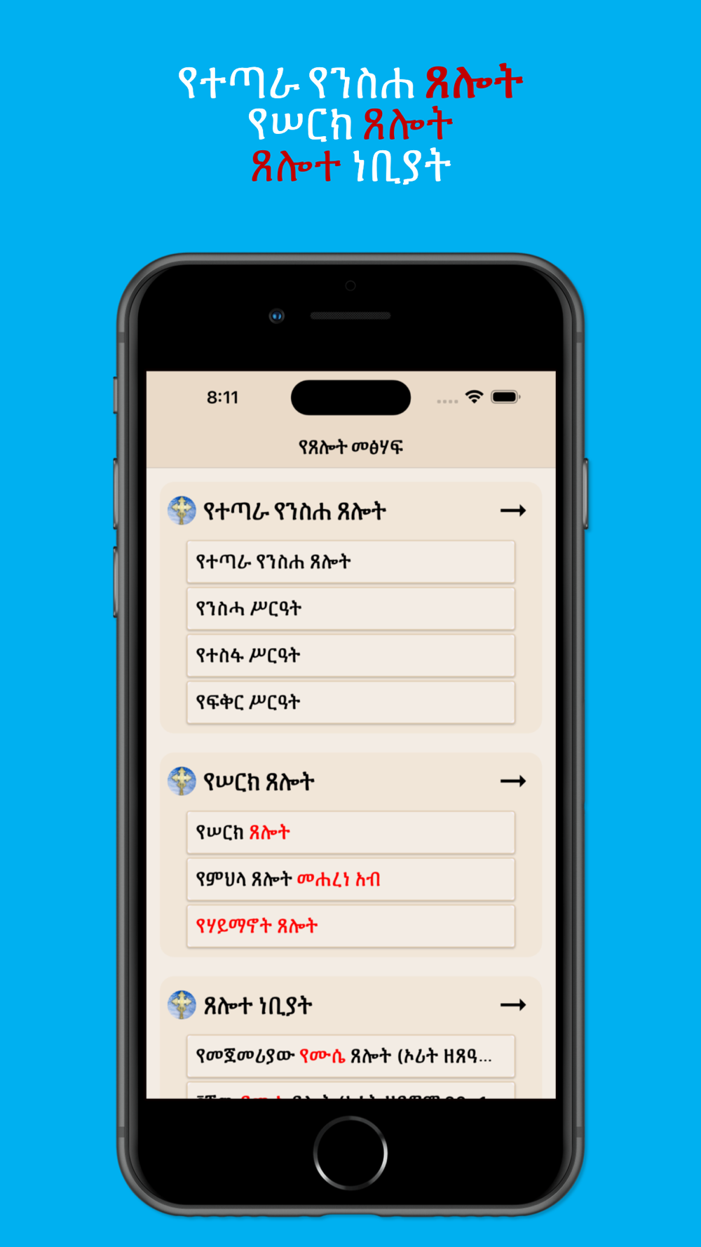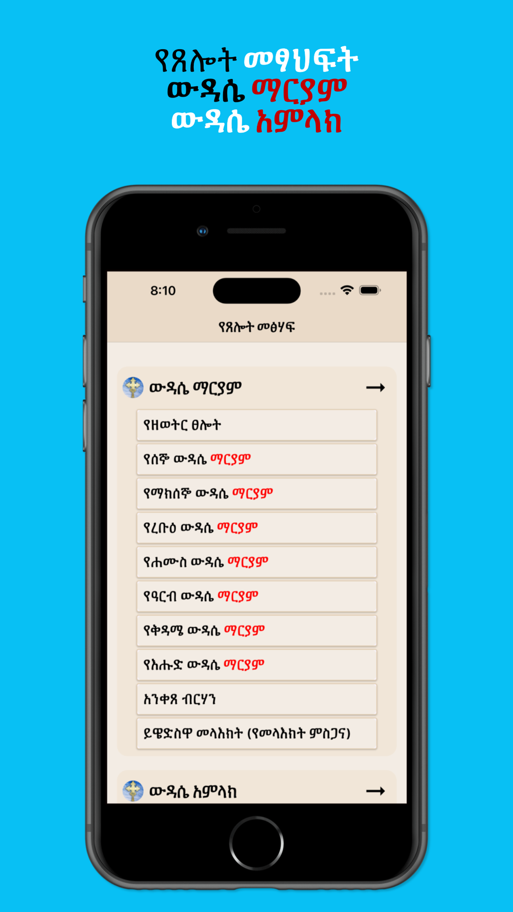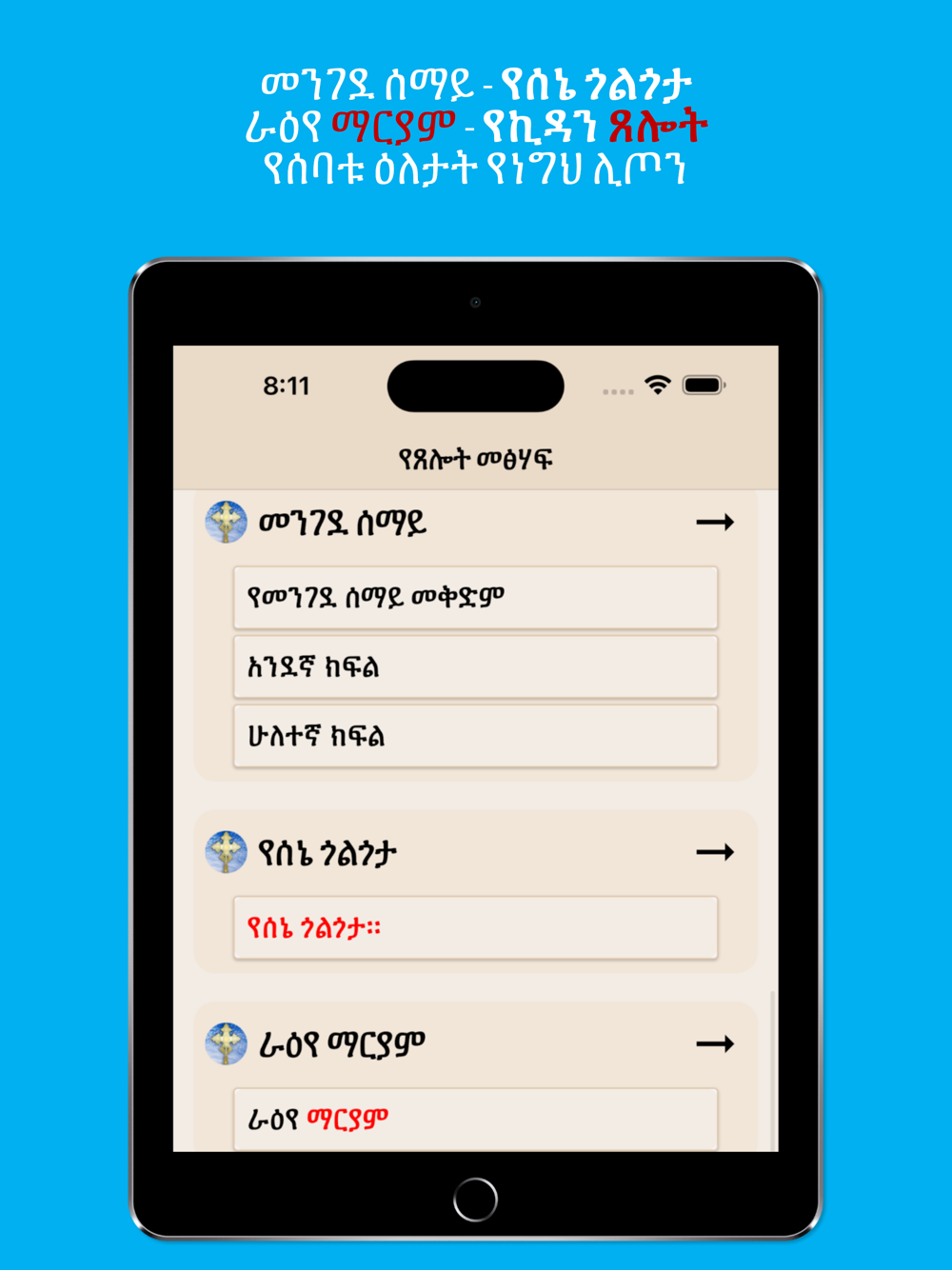 Ye Teslot Meshaf is a mobile application featuring a vast collection of Ethiopian Orthodox Tewahedo Church books in Amharic. The application offers over 10 Orthodox books categorized for easy browsing. Additionally, it includes various prayers from the Ethiopian Orthodox Church.
