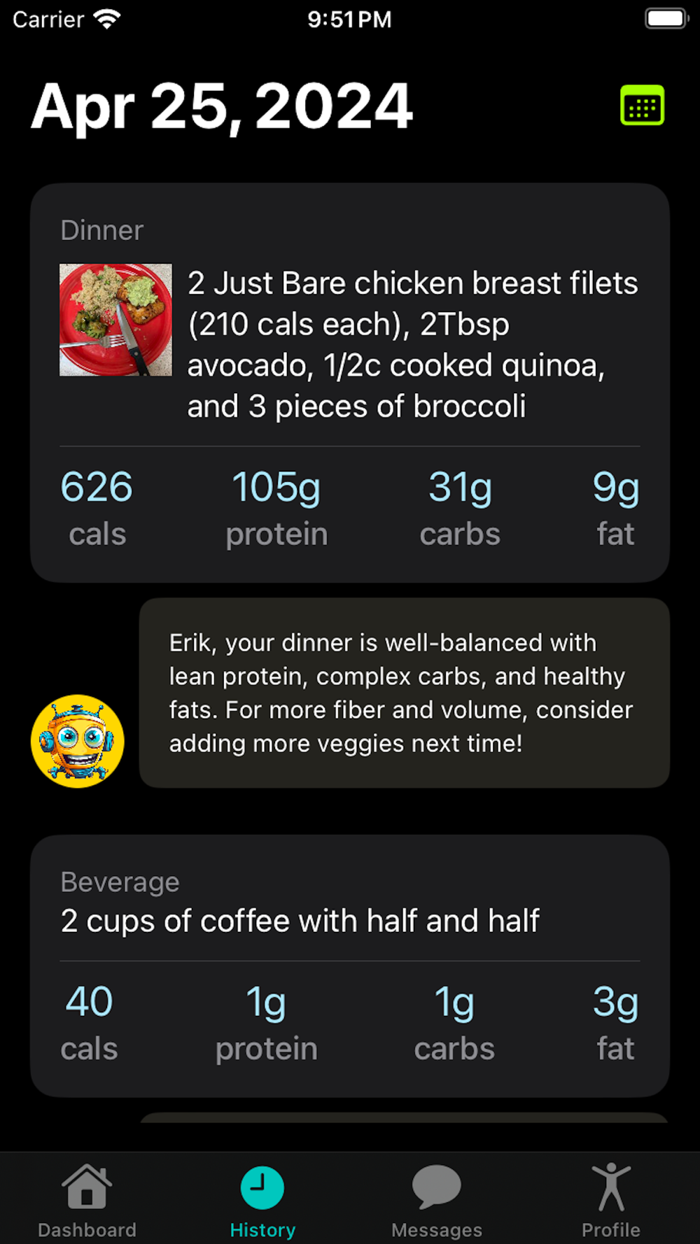Log your meals effortlessly by typing what you ate or uploading a photo. Body AI’s advanced technology analyzes your meals, providing detailed nutritional insights and helping you track calories, macros, and more with exceptional accuracy.