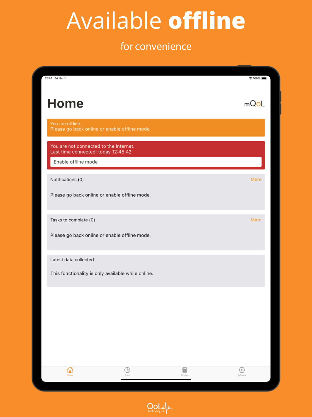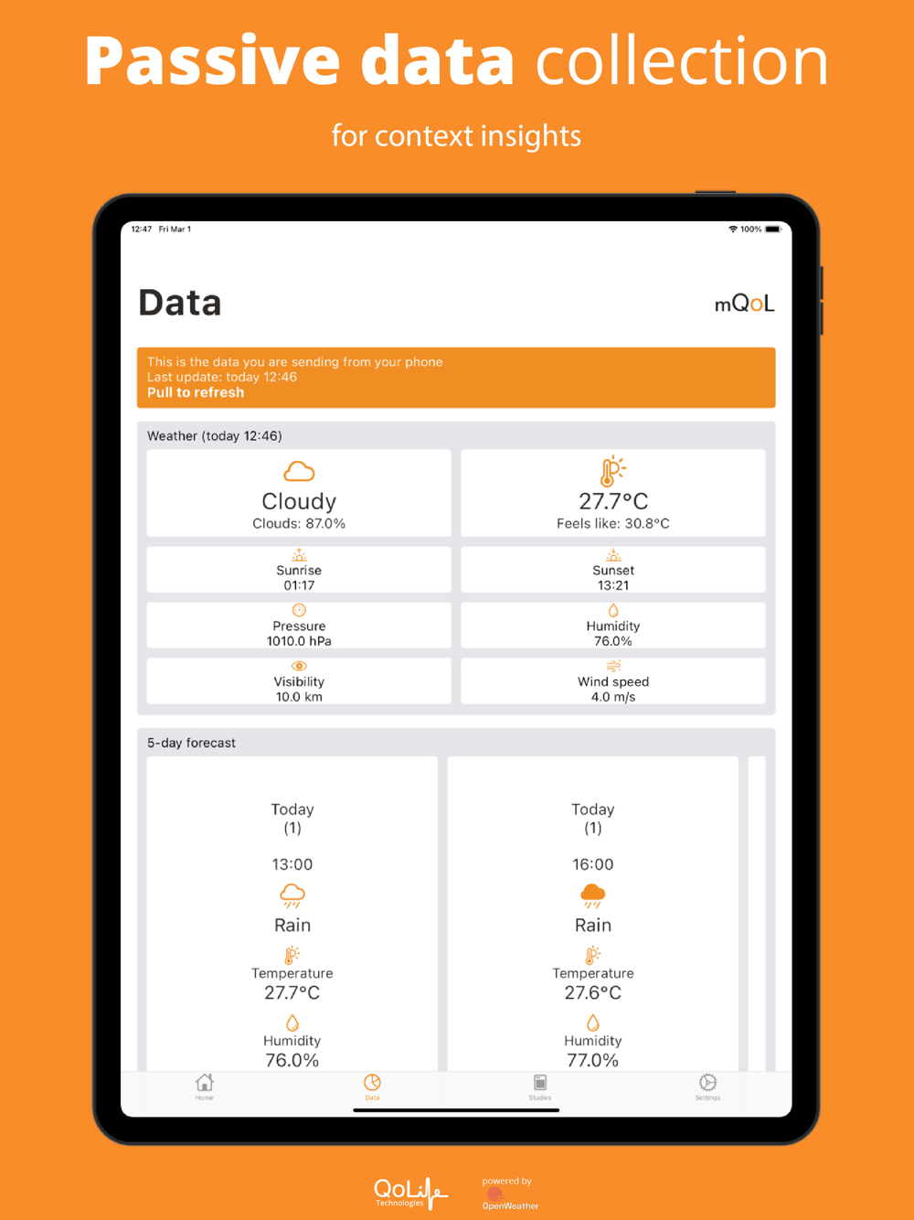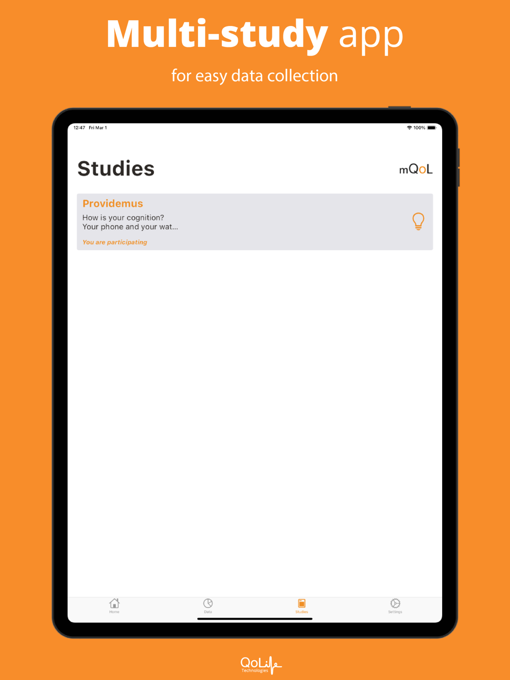 The mQoL Lab app (established in March 2012) has been used to collect research data on people's daily lives. It did so by enabling an easy, fast, unobtrusive, individual, and frequent assessment of one's state by means of validated scales, performance tests, and passive data collected by sensors. Since its first release, it has helped collect data from more than a thousand participants across Switzerland, the USA, and Denmark.