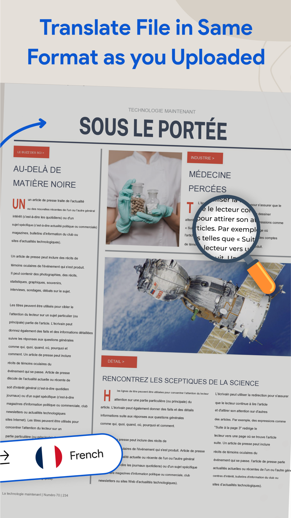 With our app, you can easily upload PDFs, PPTs, Word files, or plain text documents and have them translated into your desired language while preserving the original formatting.