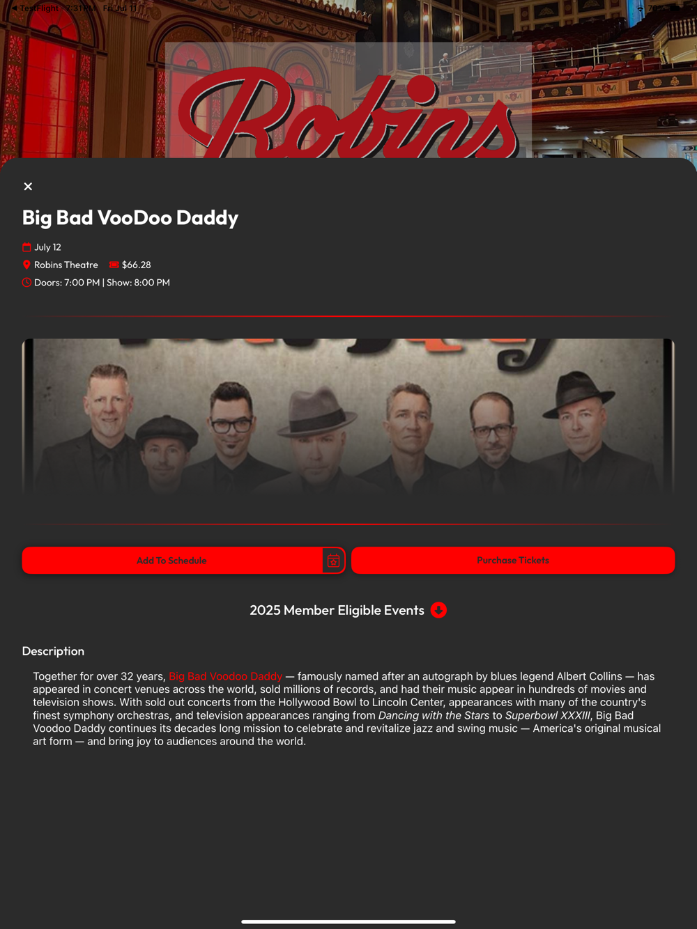 This app provides information about The Robins Theatre, upcoming events, potential rental possibilities, venue information such as capacity, seating layout charts, parking and downtown dining and technical specifications. It also provides a link to purchase tickets for upcoming events. The app also provides a brief history of the restoration of this historic theatre located in the heart of Downtown Warren, OH.