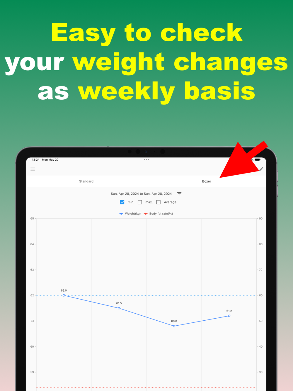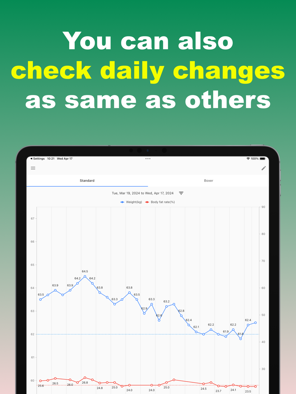 Diet or health management is a kind of long term activity. If you check daily weight which will change everyday, it’ll be difficult to see the trend of changes. Boxer Mode chart offers weekly basis chart. You can check the trend with long term perspective.