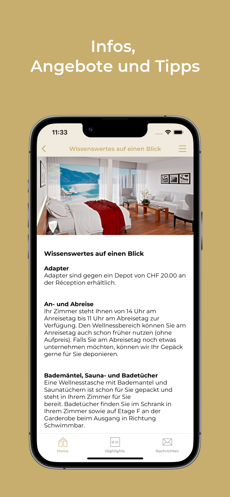 Aktuelle Neuigkeiten erhalten Sie als Push-Nachricht auf Ihr Smartphone oder Tablet — so sind Sie jederzeit bestens über unser Wellnesshotel in der Schweiz informiert.