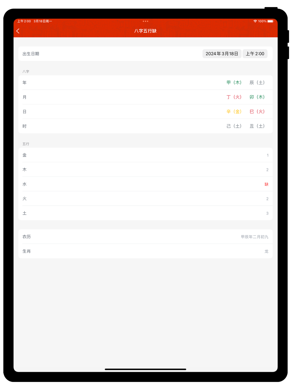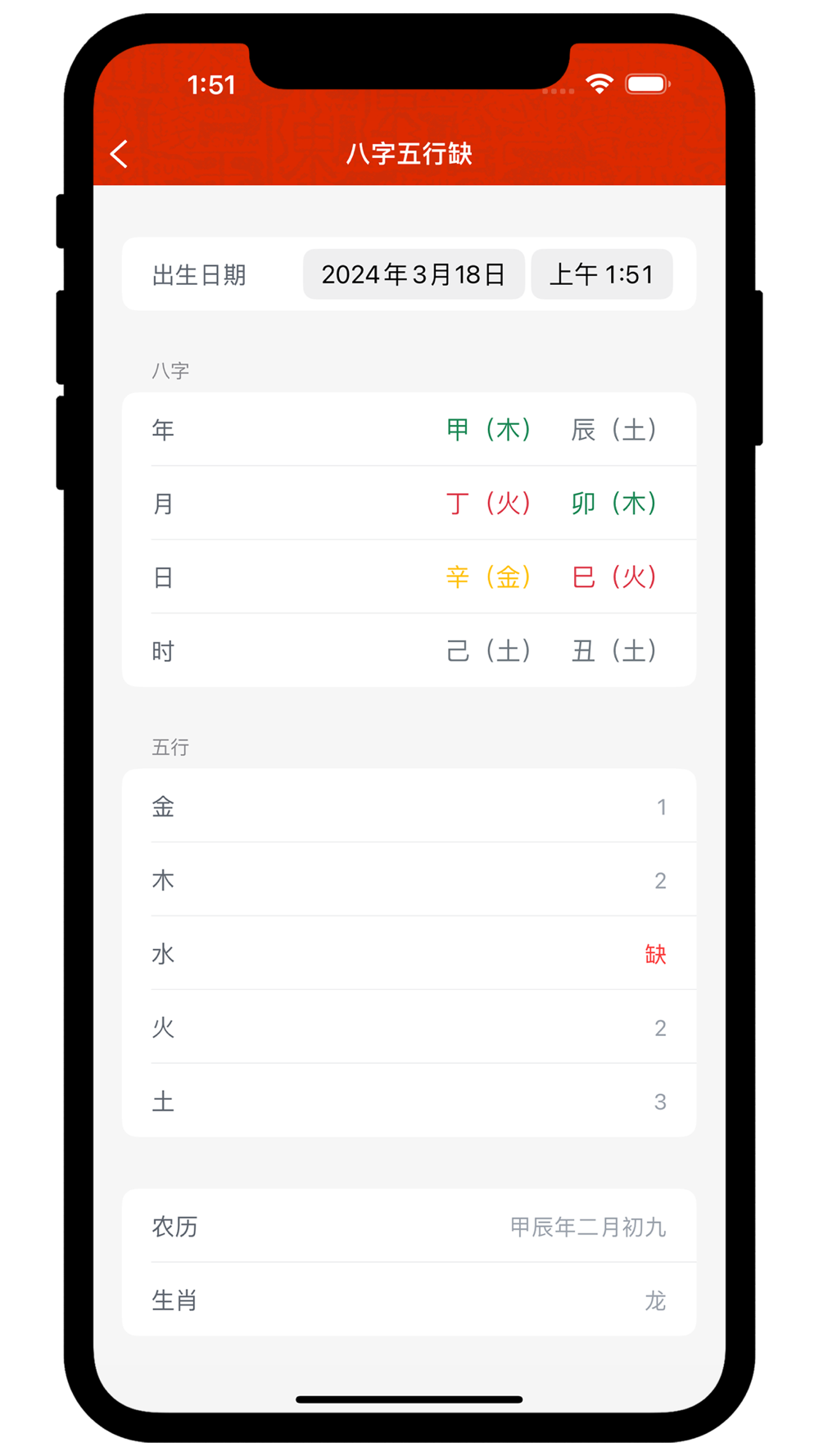 ·八字五行缺:可查询四柱八字的五行属性;