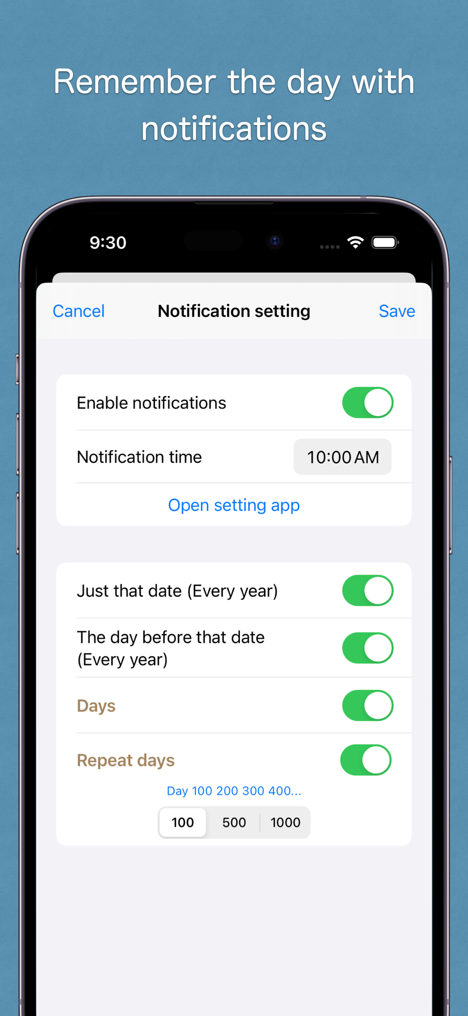 You can set notifications for the number of days you have registered or for a number of well-defined days. (Premium feature)