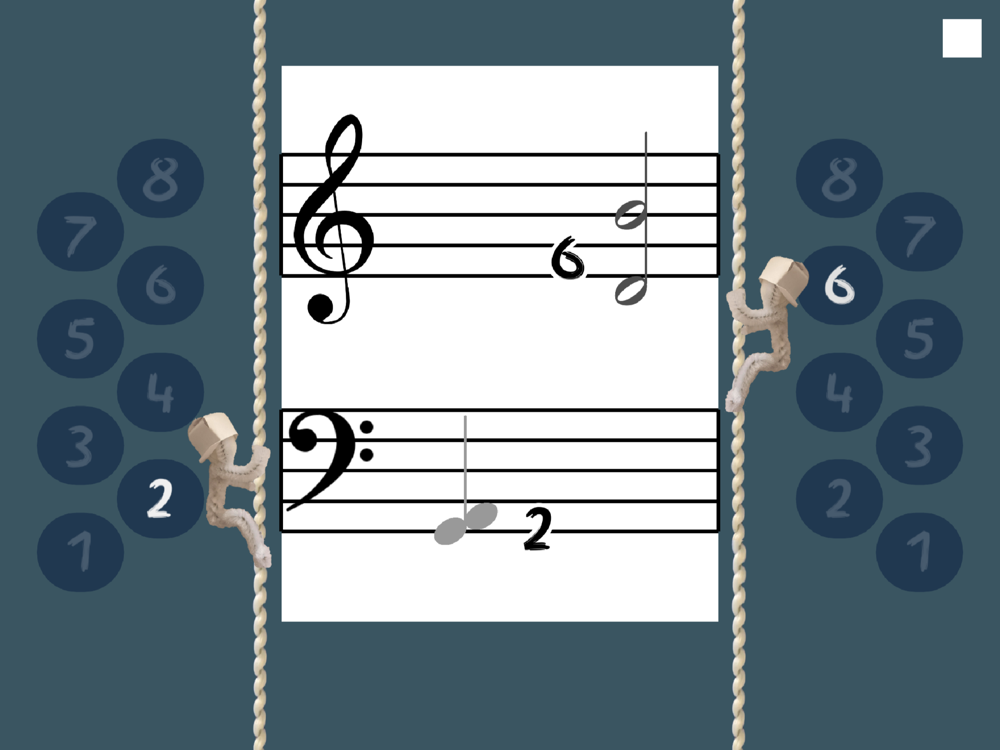 Two ways to play! Select the bottom-left button to switch between grand staff and single staff games. For the grand staff, each player has his/her own staff - see who can identify the most intervals on their staff the fastest. For the single staff, players race to be the first to select the correct degree for each interval shown. The single staff game also includes audio, so you can hear the intervals.