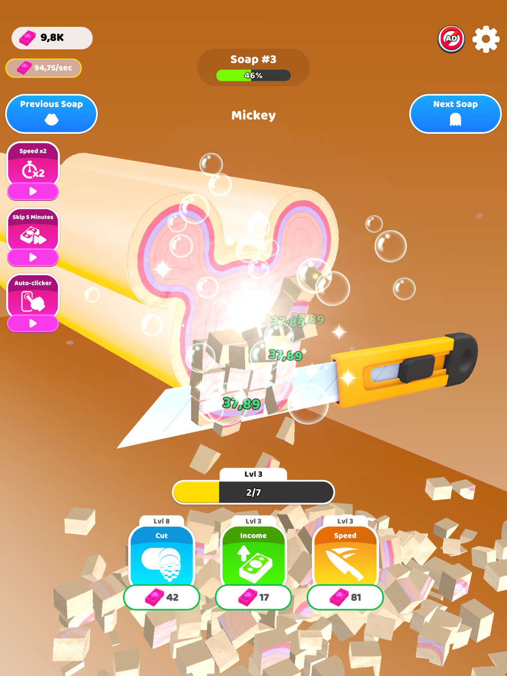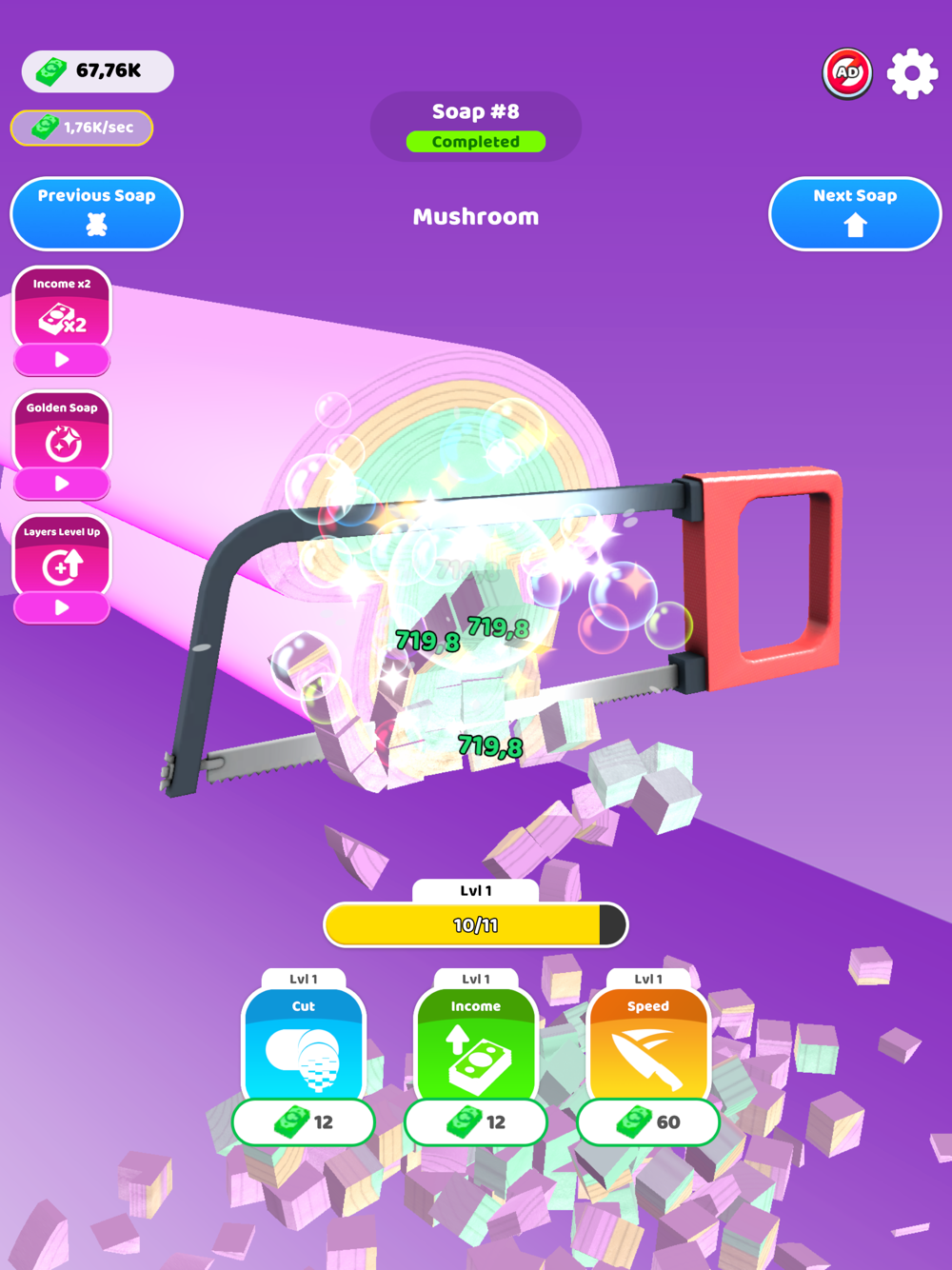 Progressive Unlocking: Unlock new soaps with unique patterns and colors, striving for 100% completion.