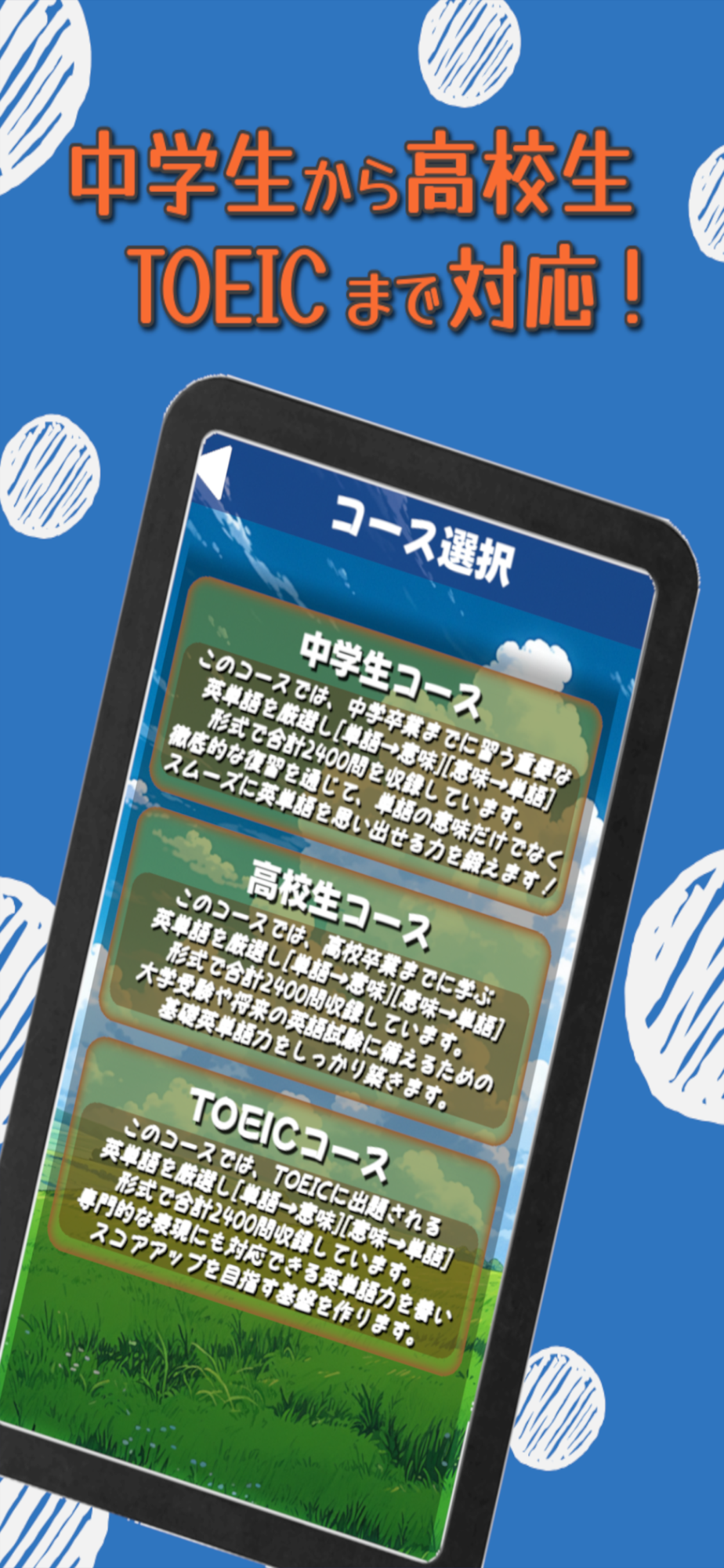 中学生/高校生向けの基本英単語に加え、新たにTOEIC向けの英単語を追加し問題7200問に!楽しく効率よく英単語を暗記できる、革新的な英単語勉強アプリです。
