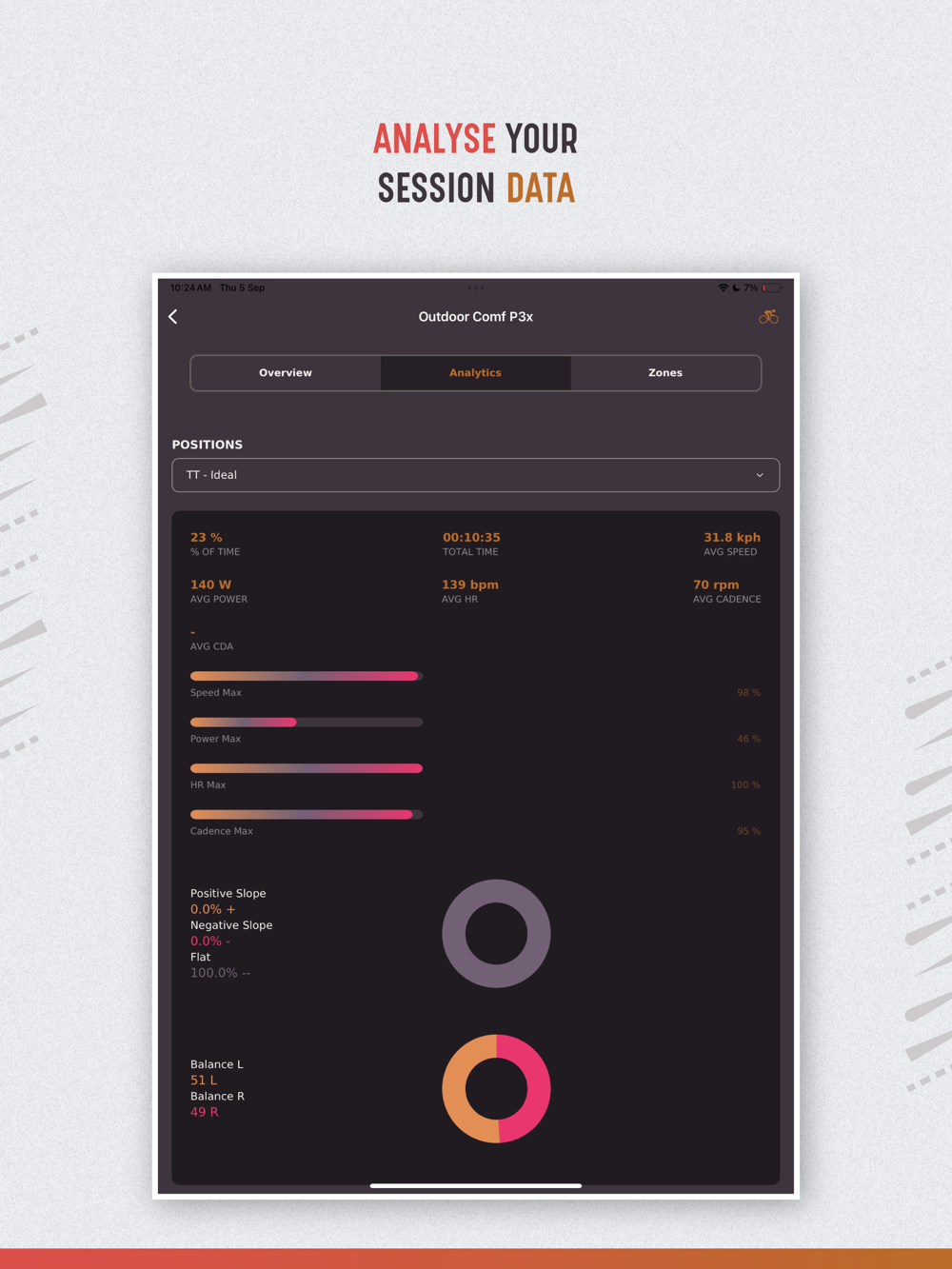 Access to overall cycling position analytics (%time spent, power, hr, speed etc. in each different position).