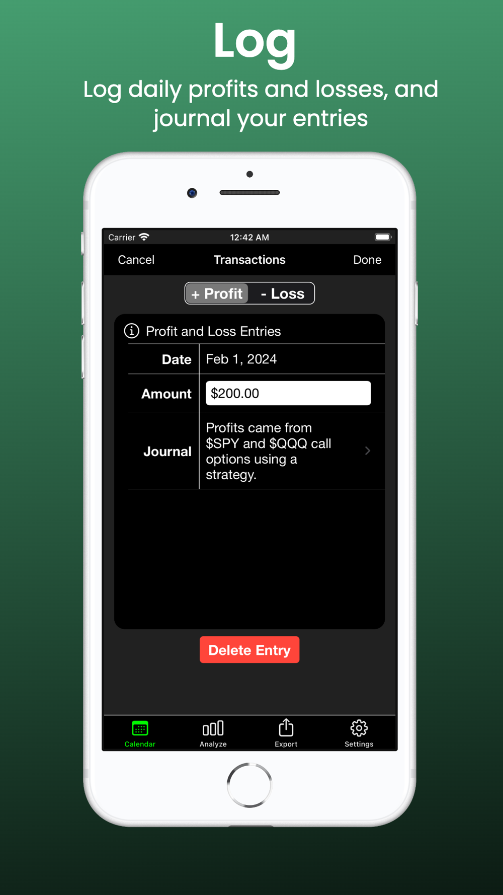 Easily log daily profits and losses, journal your entries, gain financial insights, and set goals.
