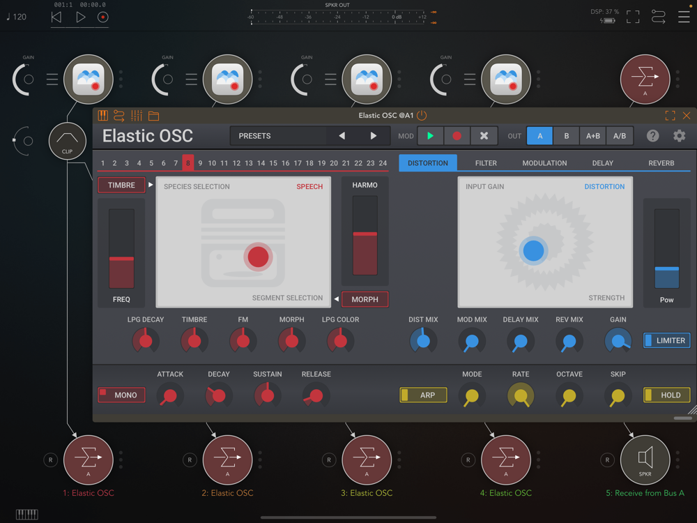 The app focuses on ease of use, featuring two XY pads for intuitive sound manipulation of the OSC engine and the effects. Despite the simplicity of the cleaned-up interface, the sound possibilities are vast – thanks to 24 different oscillator models and the ability to automate parameter changes, as it is possible in all Elastic apps released so far.