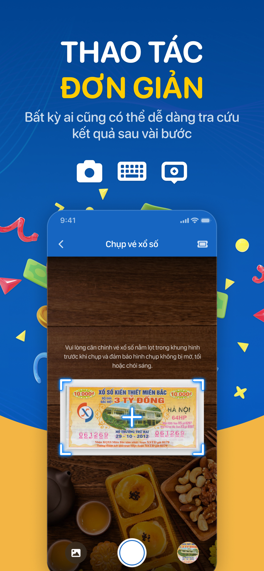 2. TRA CỨU KẾT QUẢ XỔ SỐ BẰNG HÌNH ẢNH: Chức năng này cho phép bạn chụp 1 hoặc nhiều ảnh vé xổ số liên tiếp hoặc tải ảnh lên từ bộ sưu tập để hệ thống tự động nhận diện thông tin và thực hiện so khớp với kết quả trúng thưởng.
