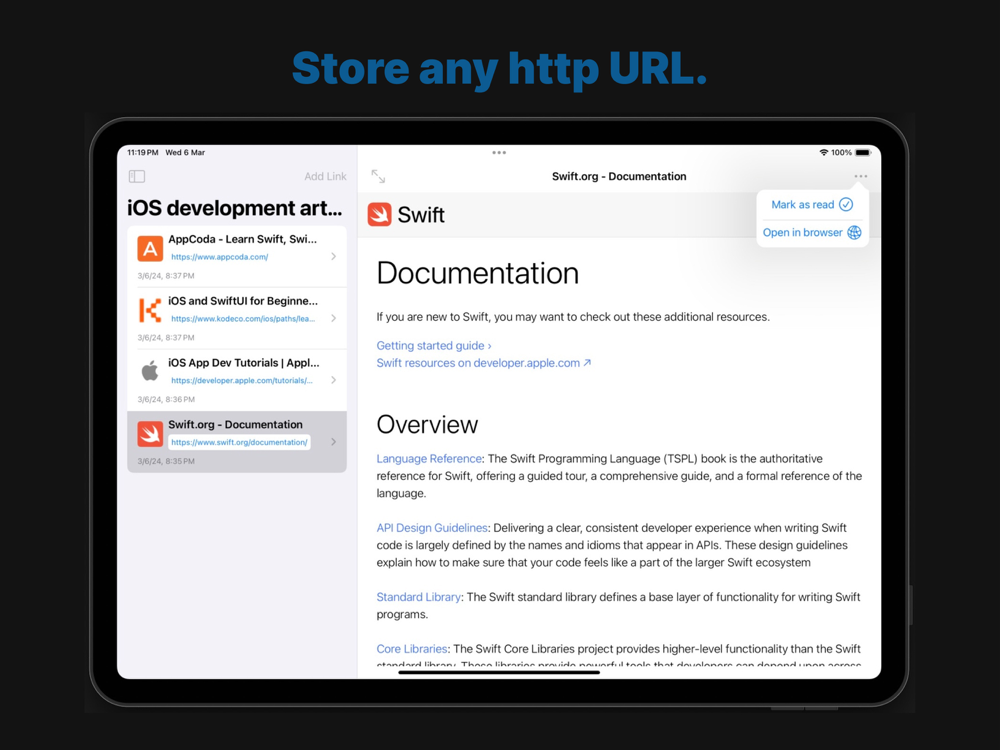 • Mark as Read Feature: Keep track of what you've visited with the ability to mark links as read, perfect for reference and follow-up.