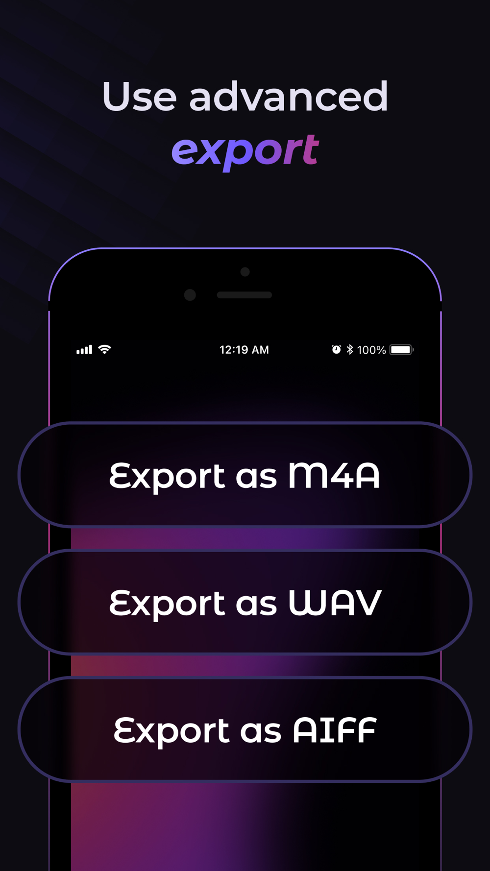 Export or share stems, or the whole readjusted song in different audio formats including m4a, wav, and aiff.
