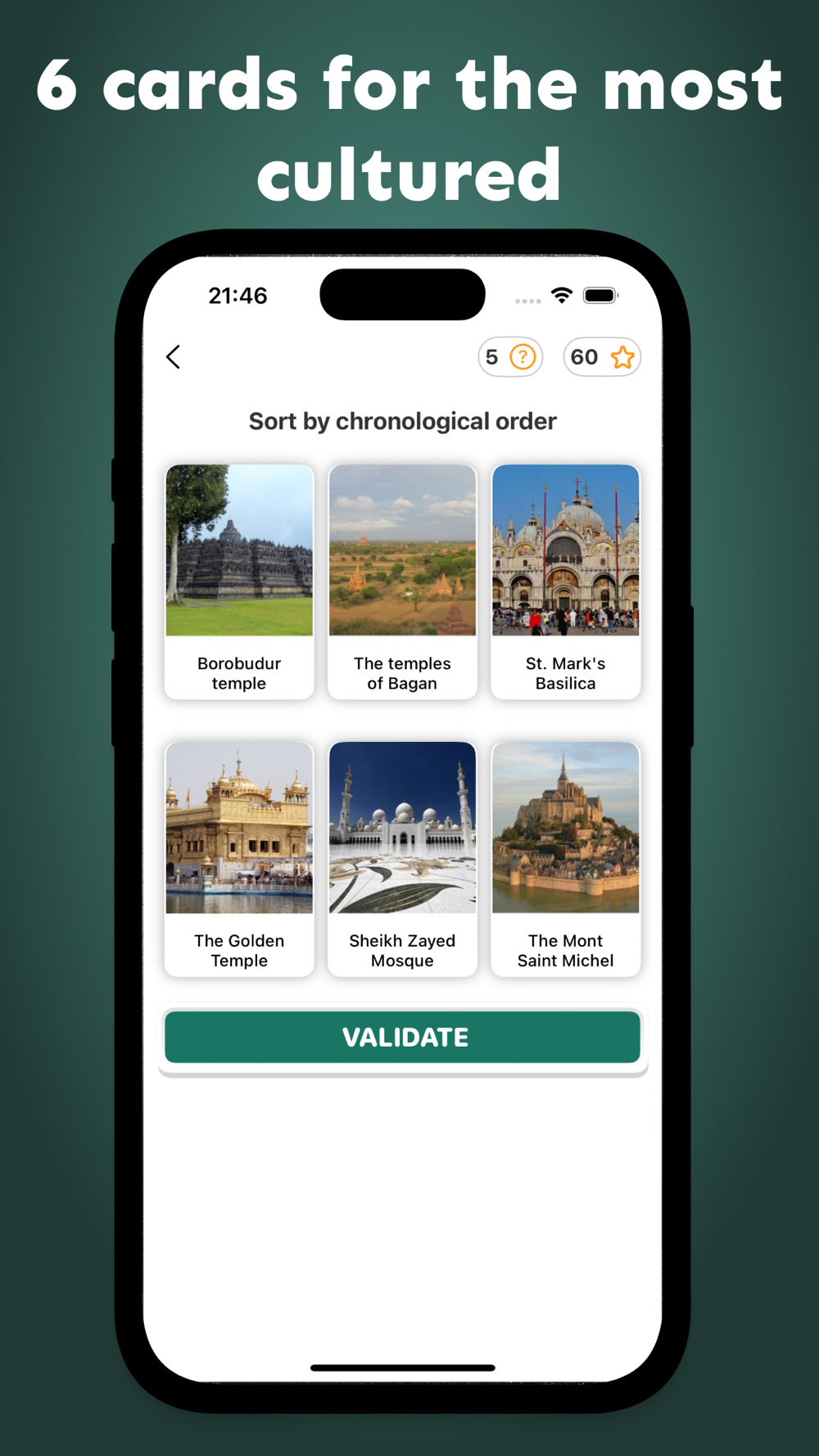You start with 3 historical event cards to sort. As you progress, you unlock new levels and categories. The more expert among you can try your hand at sorting a grid of 6 cards.