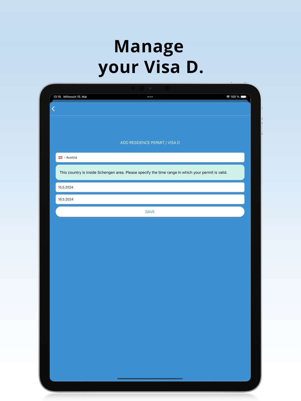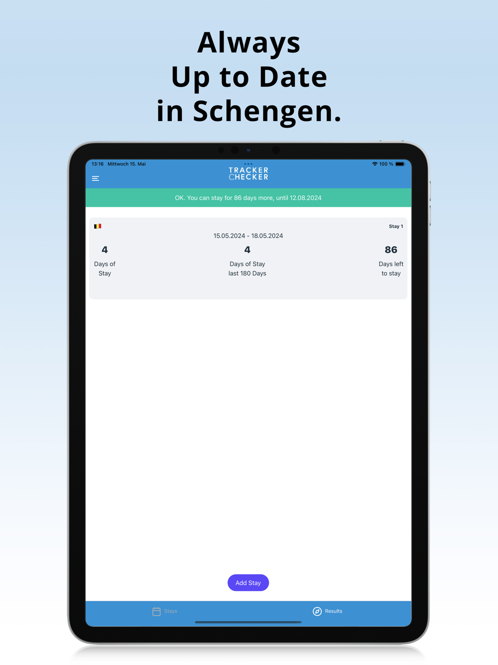 • Daily Overviews: Get daily updates on the number of days you have spent in the Schengen area within a rolling 180-day period.
