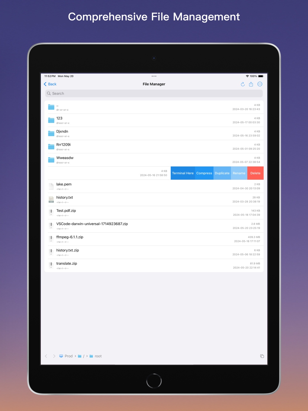 - File management (upload, download, compress, decompress, copy, delete, rename, image view, file permissions, copy path, search, follow ssh path)