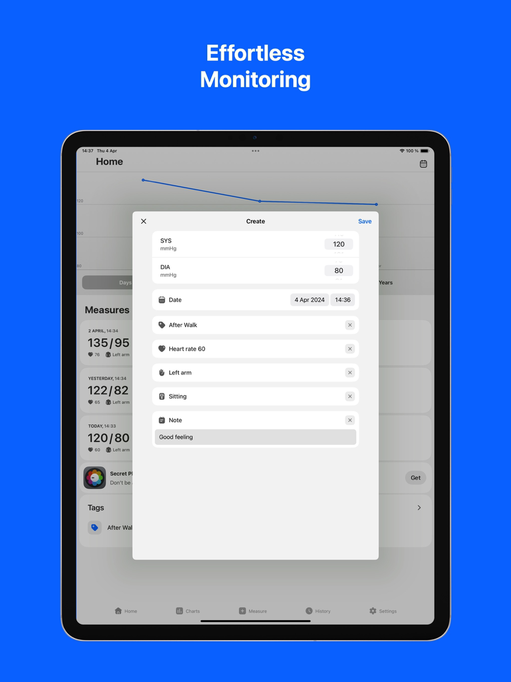 Visualize your blood pressure trends over time with intuitive graphs and charts. Track changes in your readings to gain insights into your cardiovascular health and share this data with your healthcare provider if needed