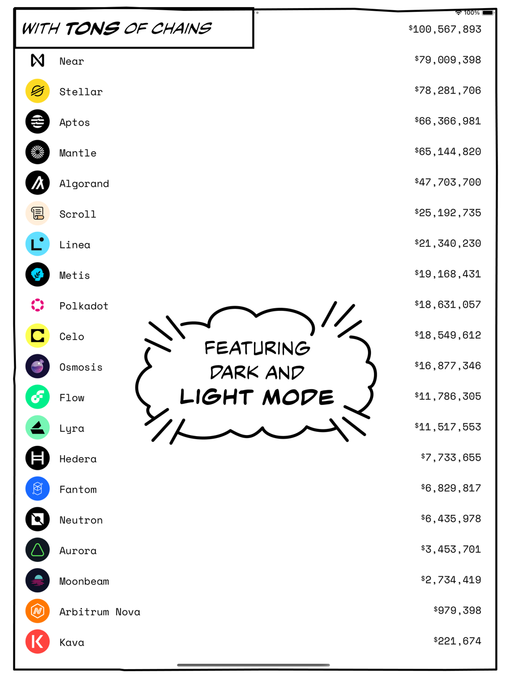The app lists all the USDC across Ethereum, Solana, Arbitrum, Base, Binance Smart Chain, Polygon, Avalanche, Optimism, Sui, Noble, Tron, zkSync, Near, Stellar, Aptos, Mantle, Algorand, Scroll, Linea, Metis, Polkadot, Celo, Osmosis, Polygon zkEVM, Flow, Lyra, Hedera, Fantom, Neutron, Aurora, Moonbeam, Arbitrum Nova, Kava, and more soon! Yes, this list is crazy long already!