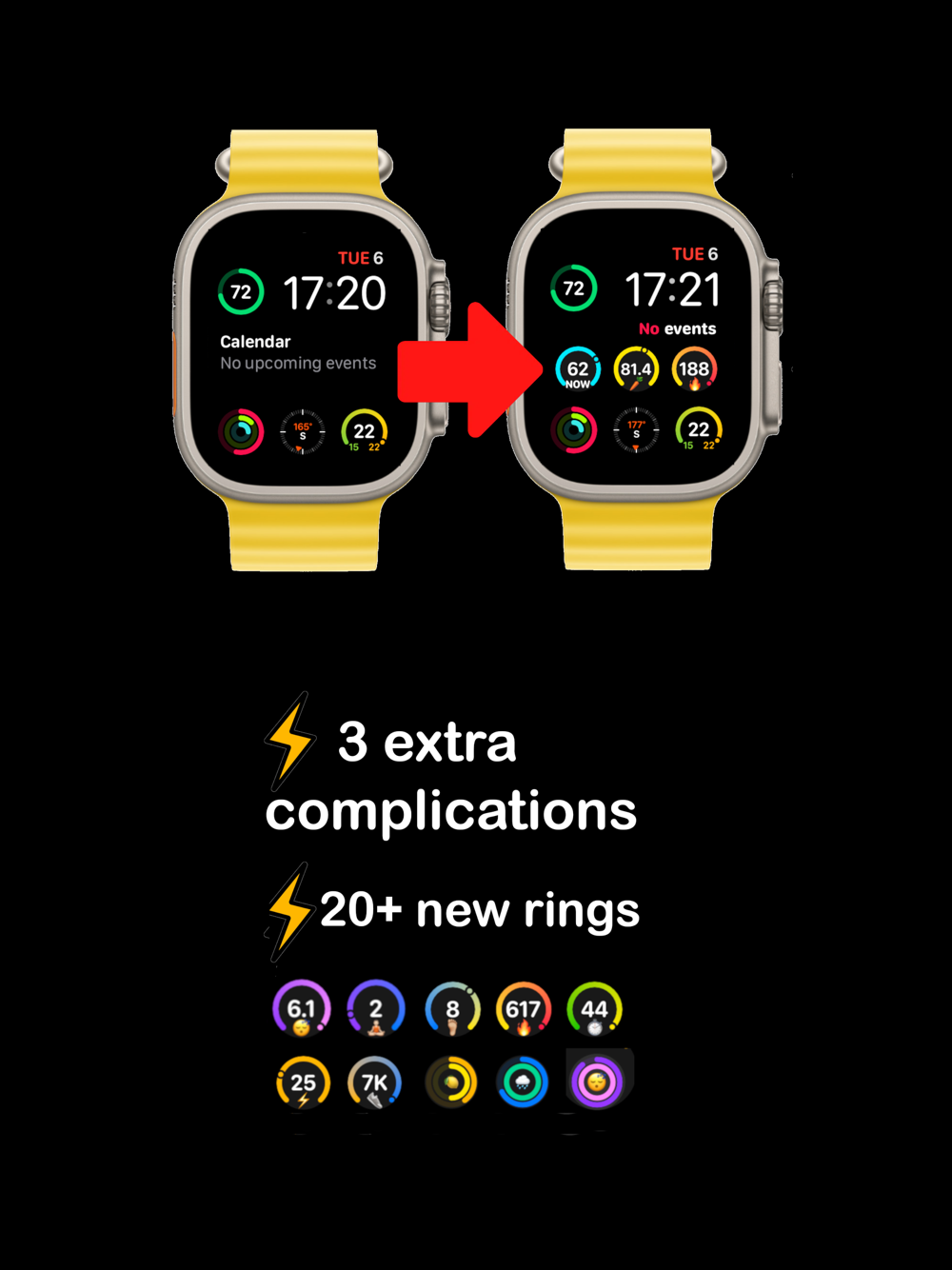 PhotoRings lets you add complication rings to a photo watch face. Choose your favourite photo and then add 3 rings on top including activity rings, steps, workouts, weight, sleep and many more.