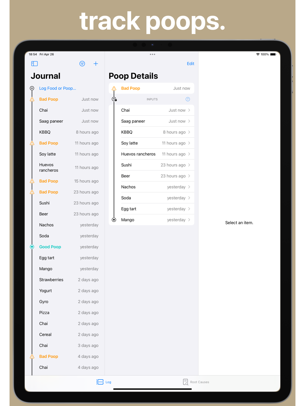 Correlate your poor bowel movements with recent meals. No nutritional inputs, no guessing at firmness, and no giant database of foods. Just type in what you ate—"latte", "pizza", "chai”—and log bowel movements as good or bad. Then put your phone away and get on with your day.