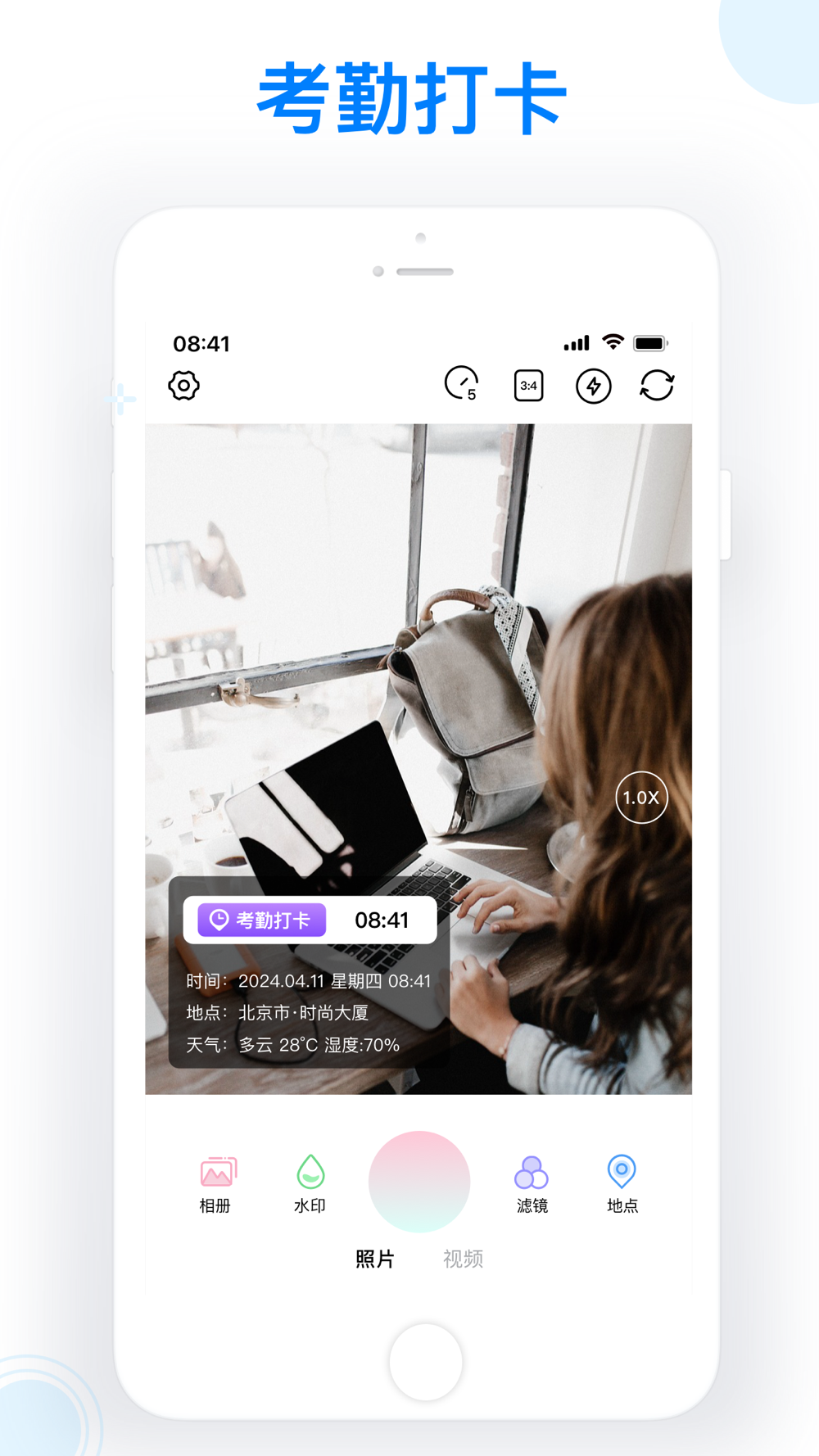 拍照片、拍视频,都能加水印。一键获取当前时间地点作为水印,真实防篡改!拍照即自动加水印,海量水印模板,时间地点精准,是你工作和生活打卡的好帮手。