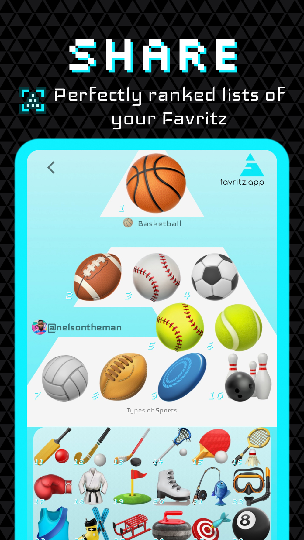 Here, we invite you to dive deep into the essence of what you love, from the cinematic brilliance of award-winning movies to the competitive thrill of sports, the depths of TV shows to the discographies of music legends, the captivating realms of video games, and beyond. Favritz is not just an app—it's your personal canvas for self-expression and a window into the worlds of others. Designed for everyone who loves to rank, share, and explore their favorite things across a multitude of categories.