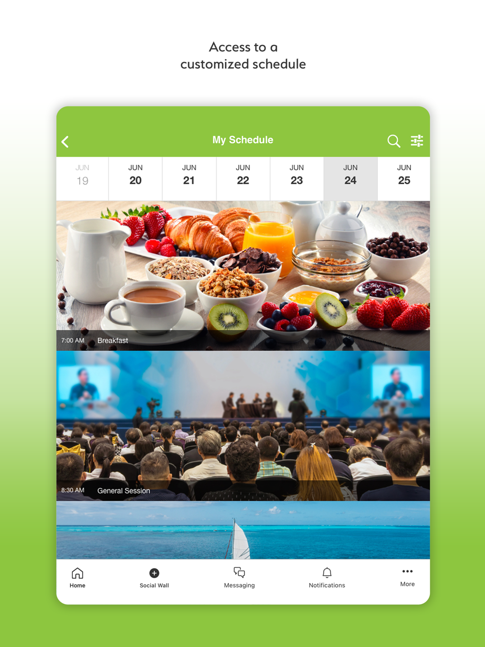 Instantly access information about the event you are attending, destination details, hotel information, and a full schedule of events. Receive instant notifications of important updates, connect with fellow attendees, post, "like" and comment on content.