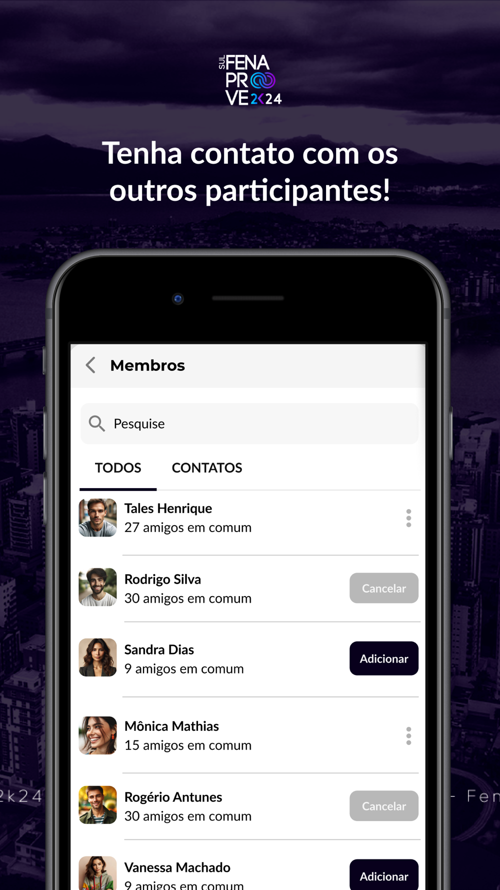 Com o aplicativo “FENAPROVE”, você tem acesso a uma rede social exclusiva, pode fazer novos contatos, enviar perguntas aos palestrantes, trocar mensagens com outros participantes, enfim, interagir com a comunidade. Além disso, você pode consultar a programação, avaliar conteúdos, dar feedback e responder quizzes. Utilize o APP e aproveite ao máximo os recursos.