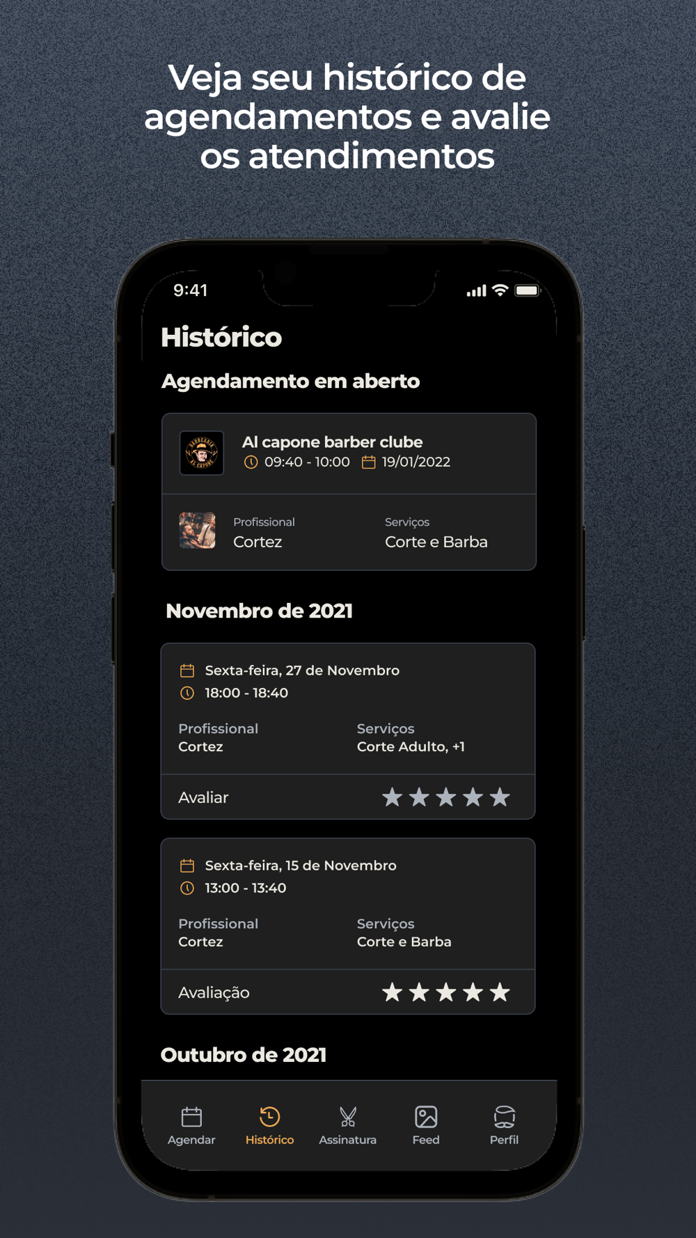 Através do App Al Capone Barber Clube os clientes podem realizar seus agendamentos de uma forma muito mais prática. Na tela inicial, é possível selecionar os serviços e horário desejado para seu próximo atendimento. Já na tela de histórico, você poderá avaliar como foi o seu atendimento, remarcar ou cancelar seus agendamentos. É possível também na tela do perfil o cliente editar suas informações, como e-mail, foto de perfil e telefone.
