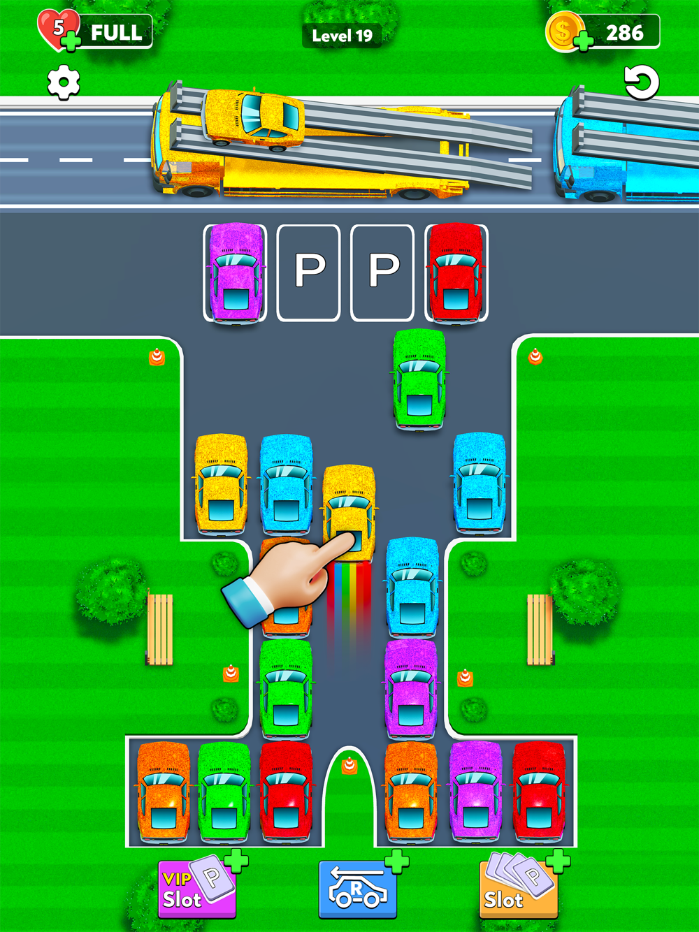- Solve the parking puzzle by loading all cars onto the right-colored truck.