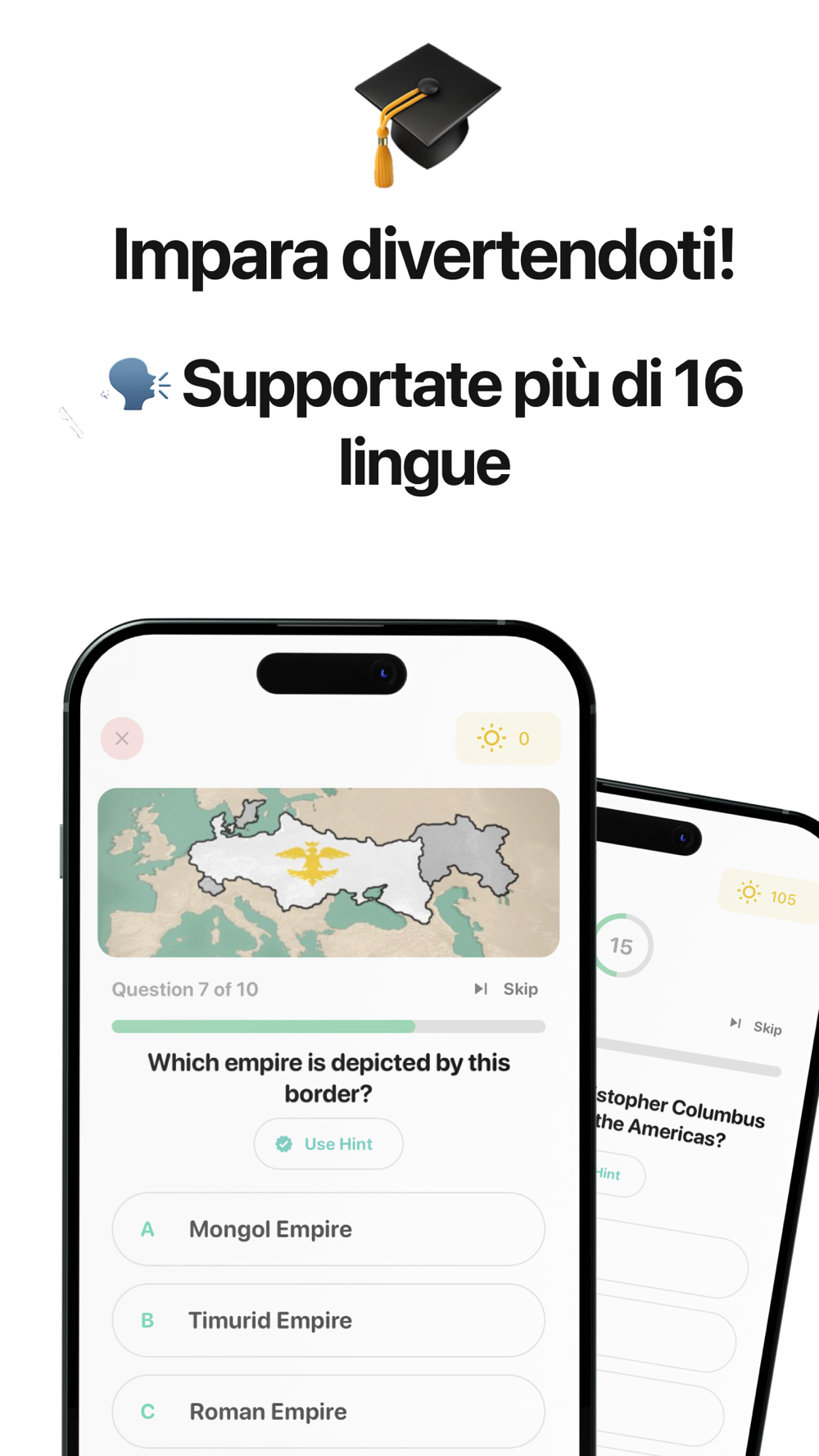 La nostra app supporta 16 lingue: arabo, tedesco, inglese, spagnolo, francese, croato, indonesiano, italiano, giapponese, coreano, polacco, portoghese, rumeno, turco, ucraino e vietnamita, garantendo l'accessibilità agli appassionati di storia di tutto il mondo.