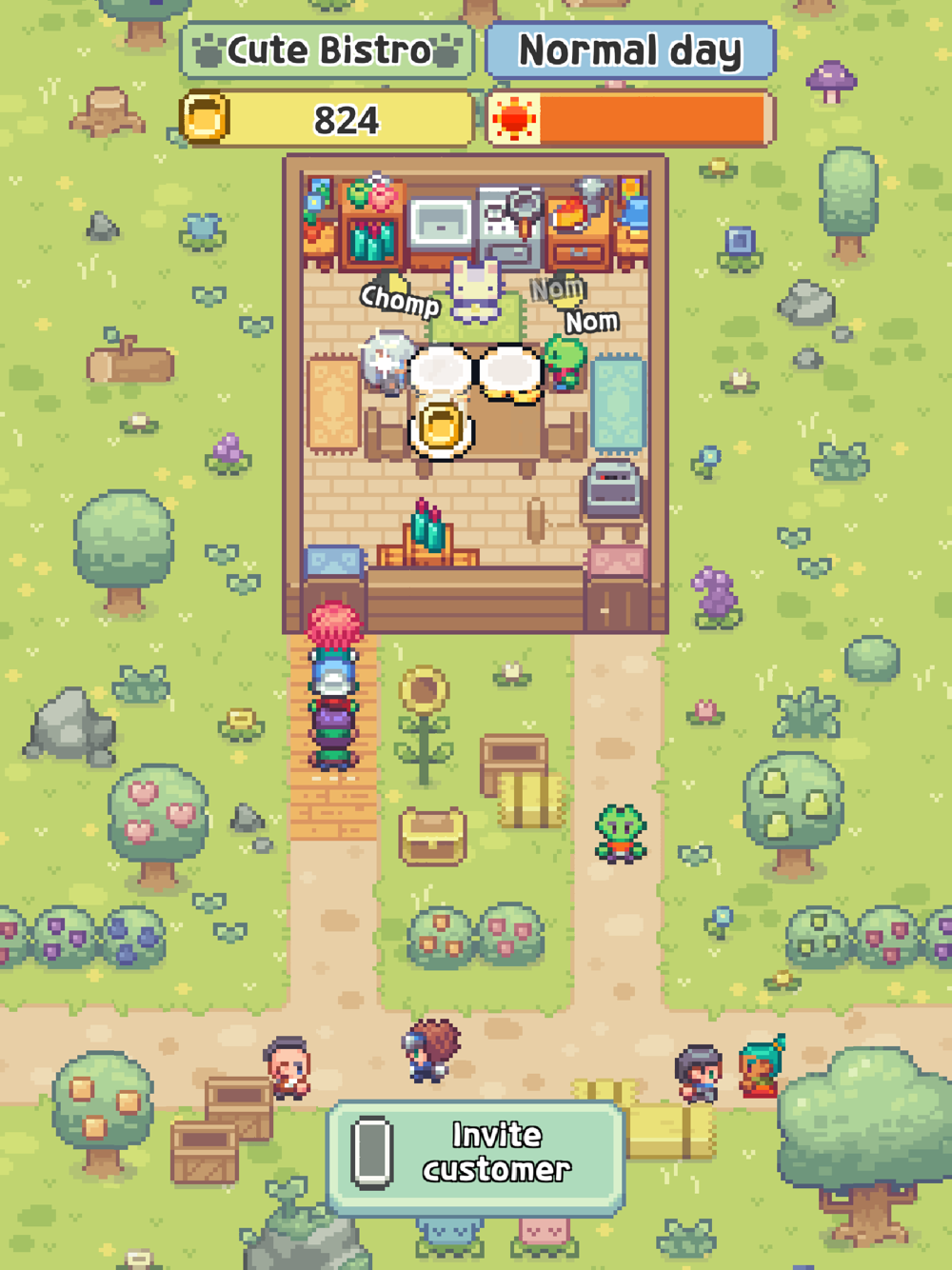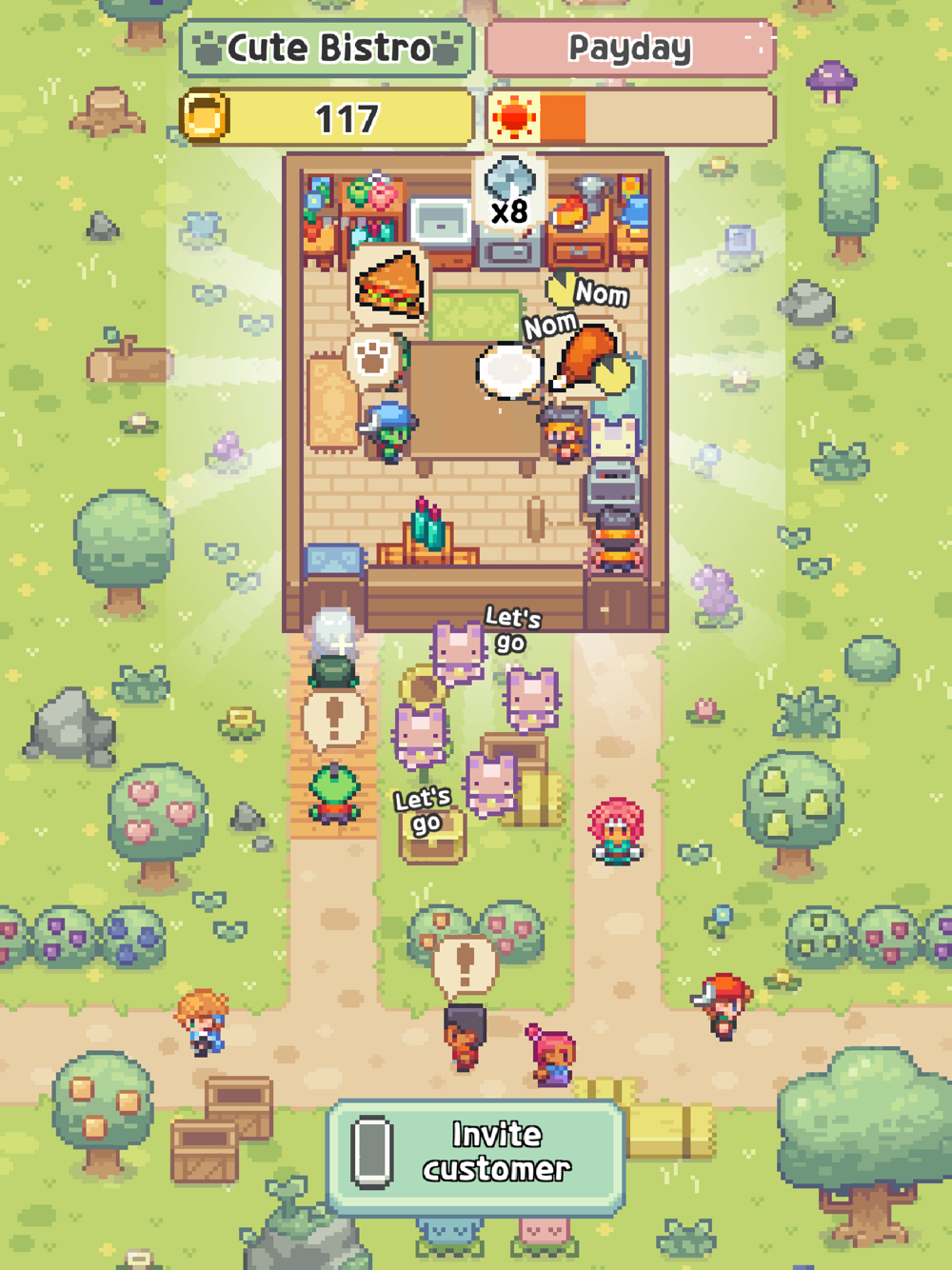 - Use the money earned to upgrade your bistro, market, and working cats, meow!