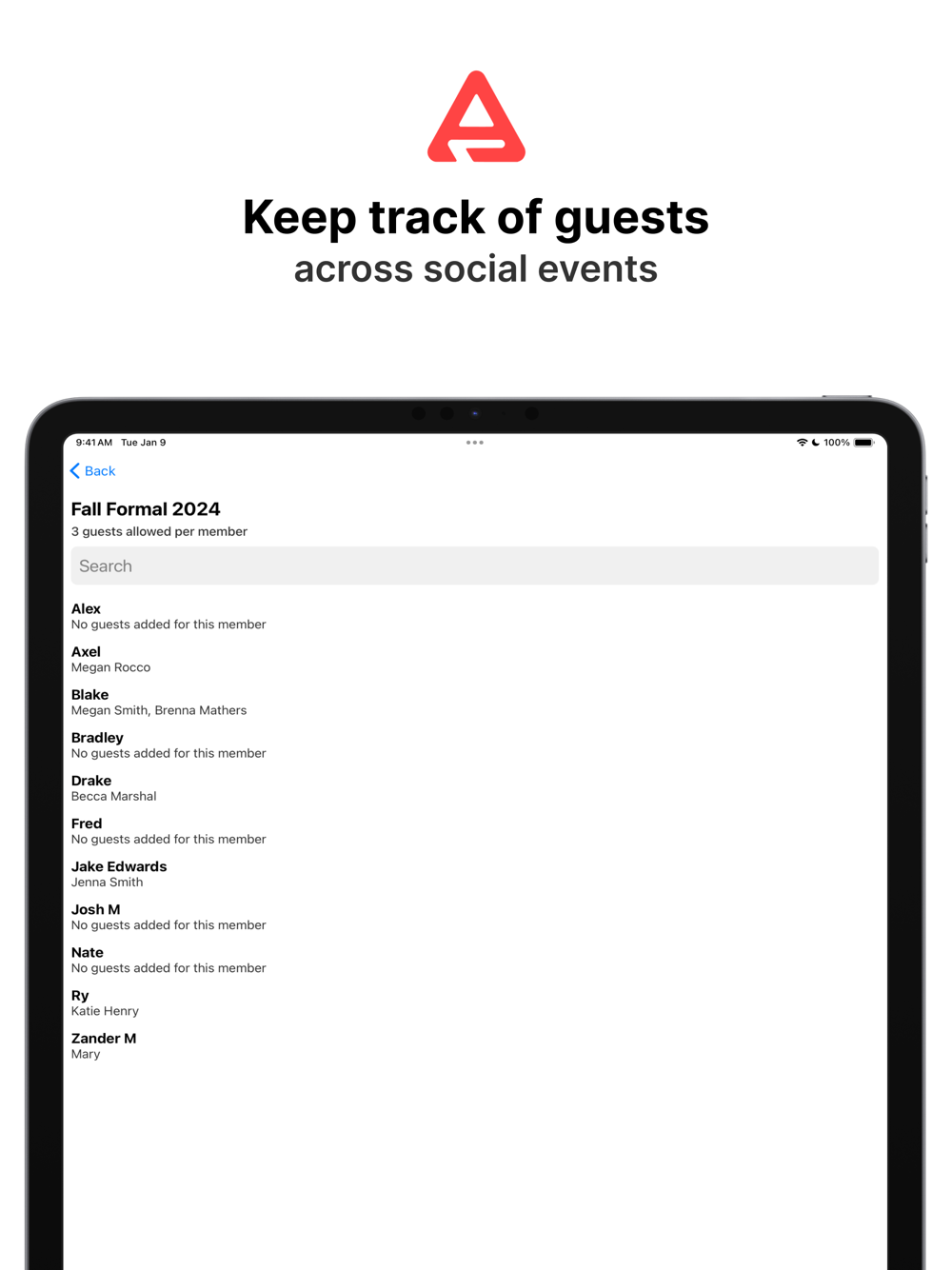 Have an upcoming social event that is invite-only? Create guest lists that are easily searchable so that you can quickly verify if someone is on the list or not. You're able to set a maximum amount of guests per member ensuring that no member invites more than they're supposed to.