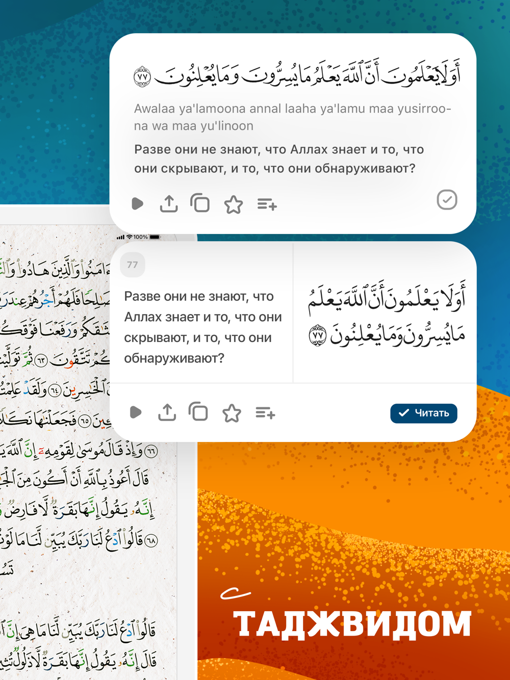 • Функция «Следовать за чтецом» для прослушивания чтения Корана на арабском языке с последующим чтением перевода.